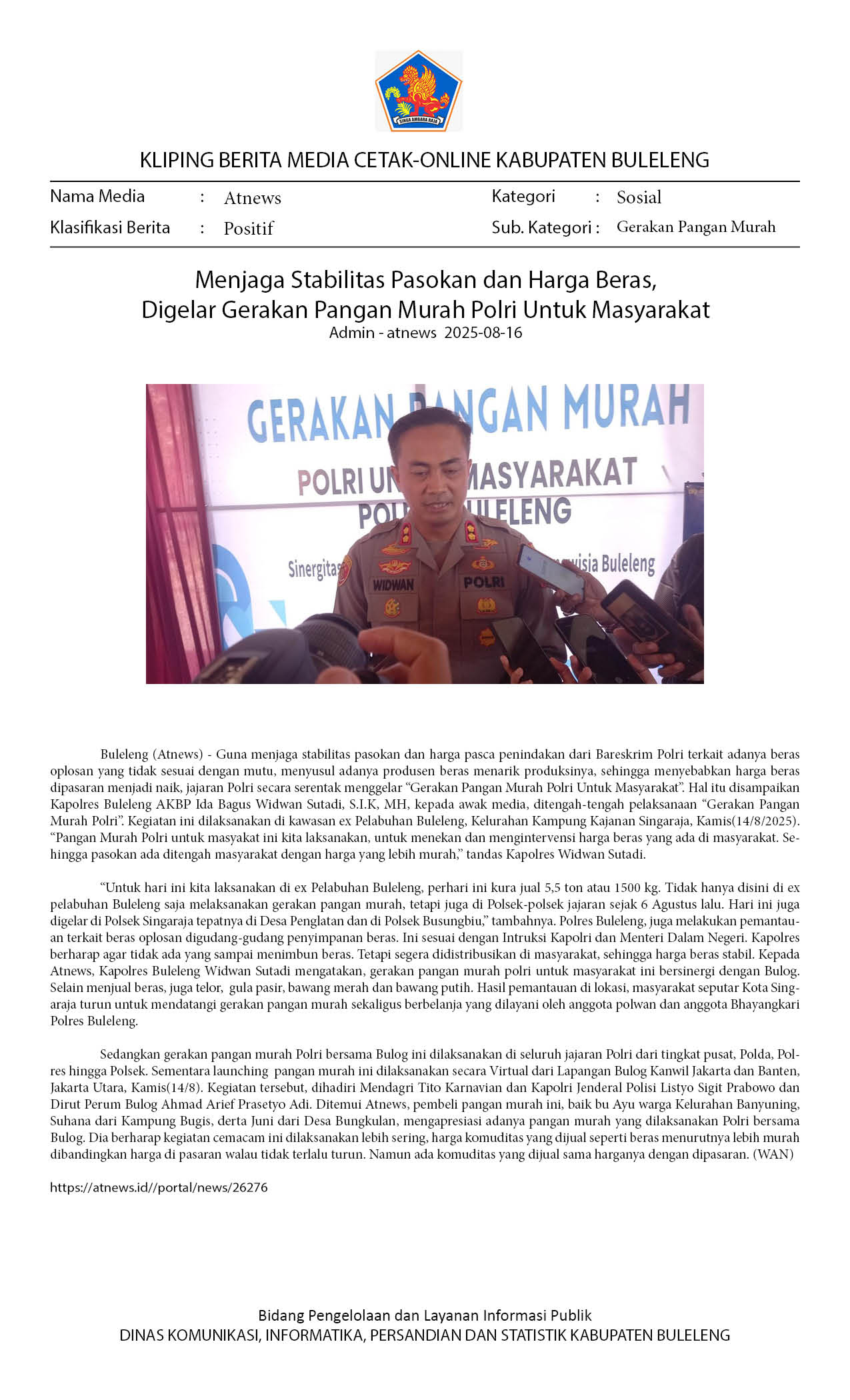 MENJAGA STABILITAS PASOKAN DAN HARGA BERAS, DIGELAR GERAKAN PANGAN MURAH POLRI UNTUK MASYARAKAT