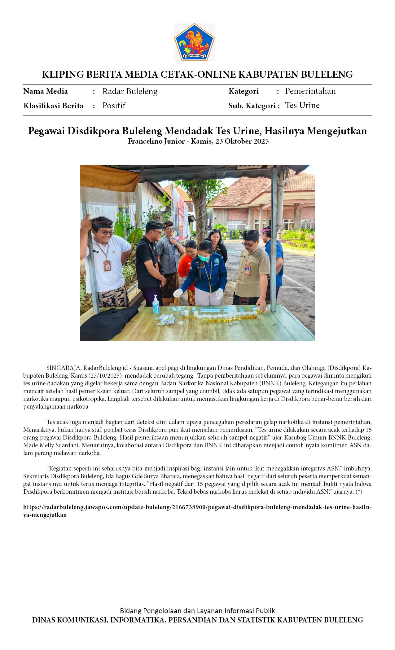 PEGAWAI DISDIKPORA BULELENG MENDADAK TES URINE, HASILNYA MENGEJUTKAN