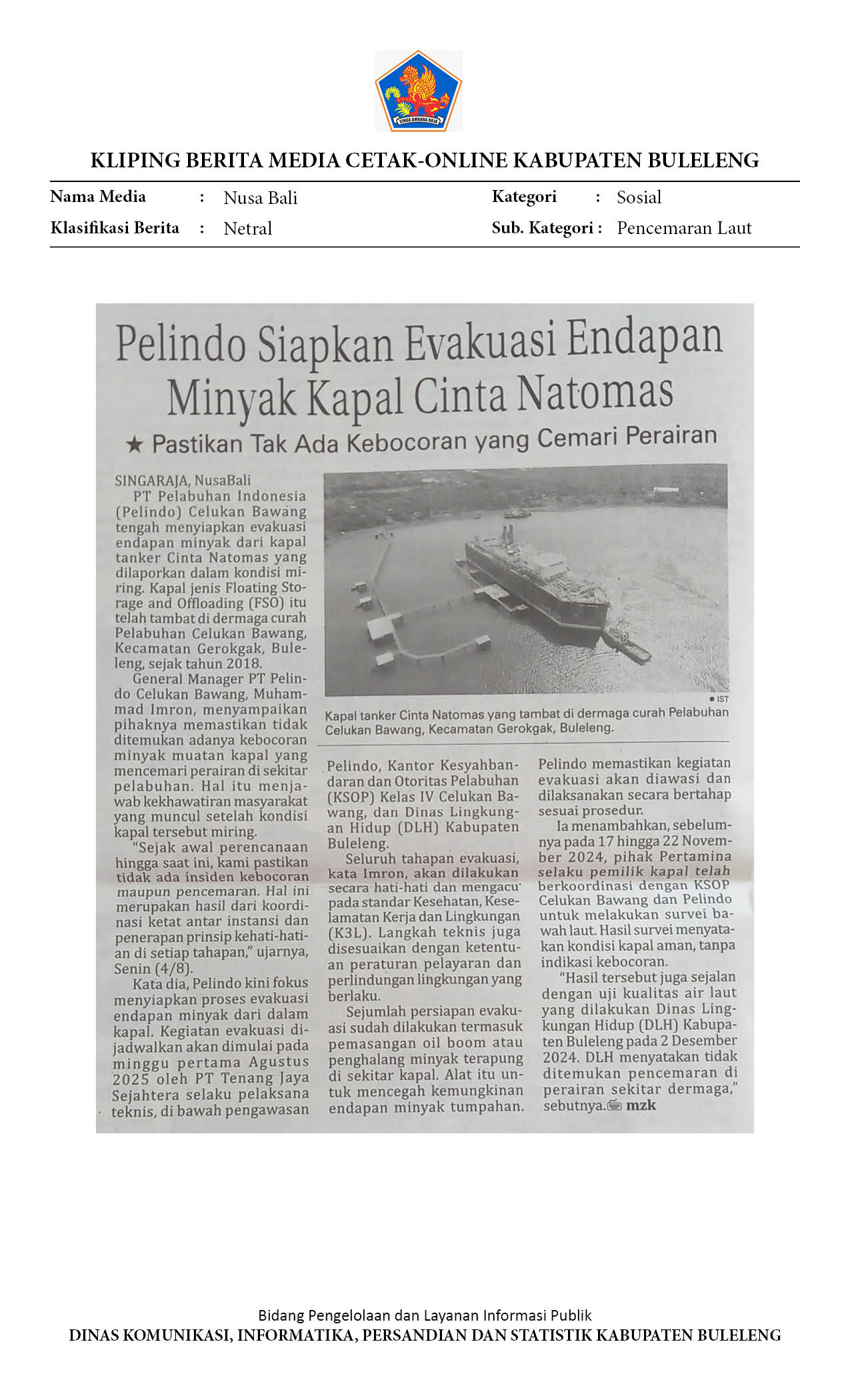 PELINDO SIAPKAN EVAKUASI ENDAPAN MINYAK KAPAL CINTA NATOMAS