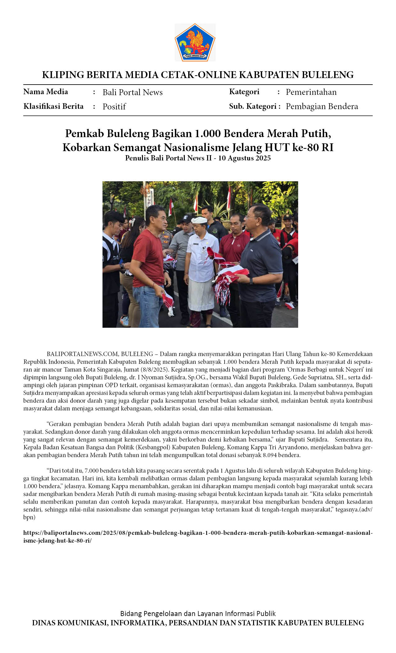 PEMKAB BULELENG BAGIKAN 1.000 BENDERA MERAH PUTIH, KOBARKAN SEMANGAT NASIONALISME JELANG HUT KE-80 RI