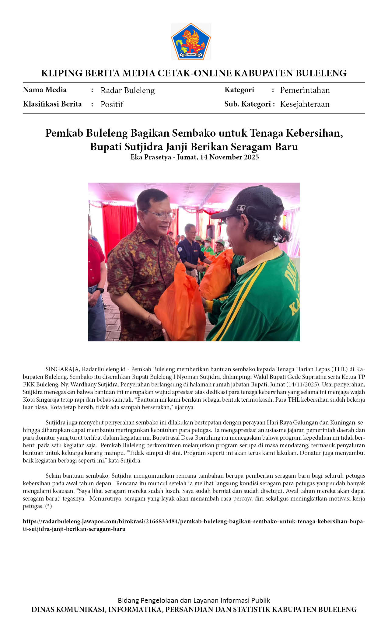 PEMKAB BULELENG BAGIKAN SEMBAKO UNTUK TENAGA KEBERSIHAN, BUPATI SUTJIDRA JANJI BERIKAN SERAGAM BARU