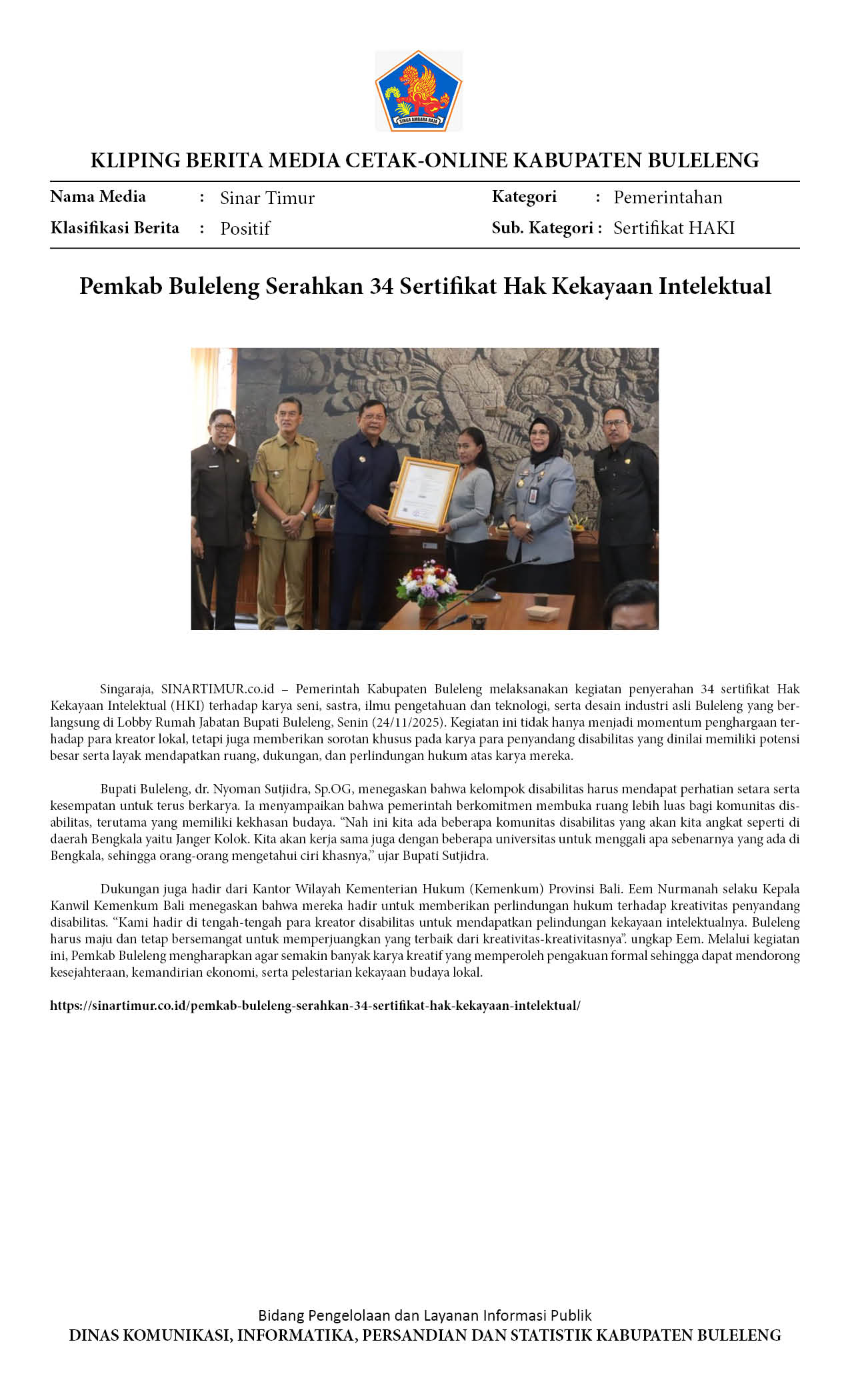 PEMKAB BULELENG SERAHKAN 34 SERTIFIKAT HAK KEKAYAAN INTELEKTUAL