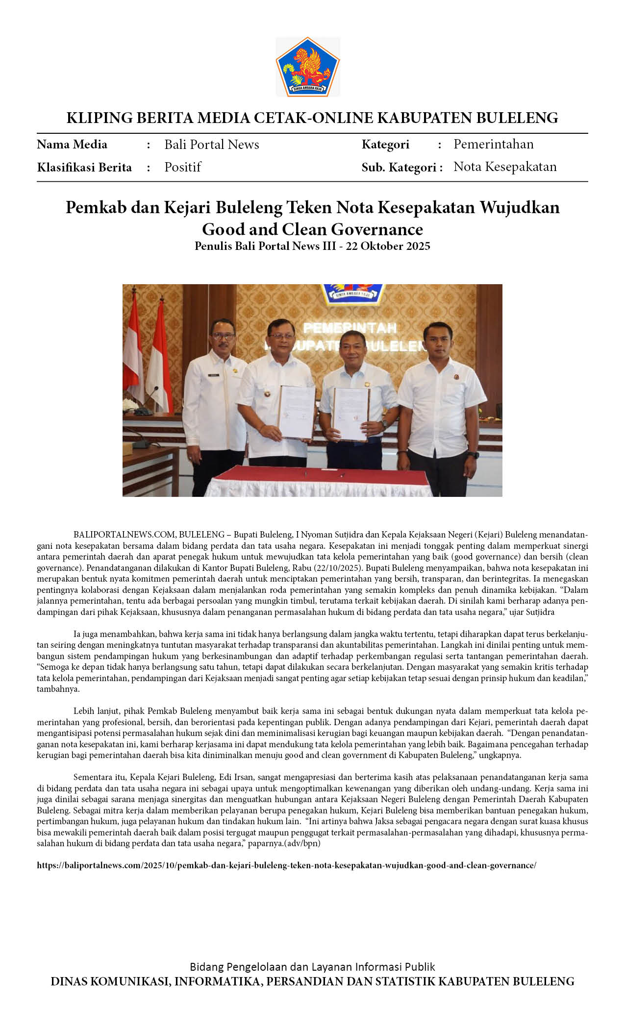 PEMKAB DAN KEJARI BULELENG TEKEN NOTA KESEPAKATAN WUJUDKAN GOOD AND CLEAN GOVERNANCE