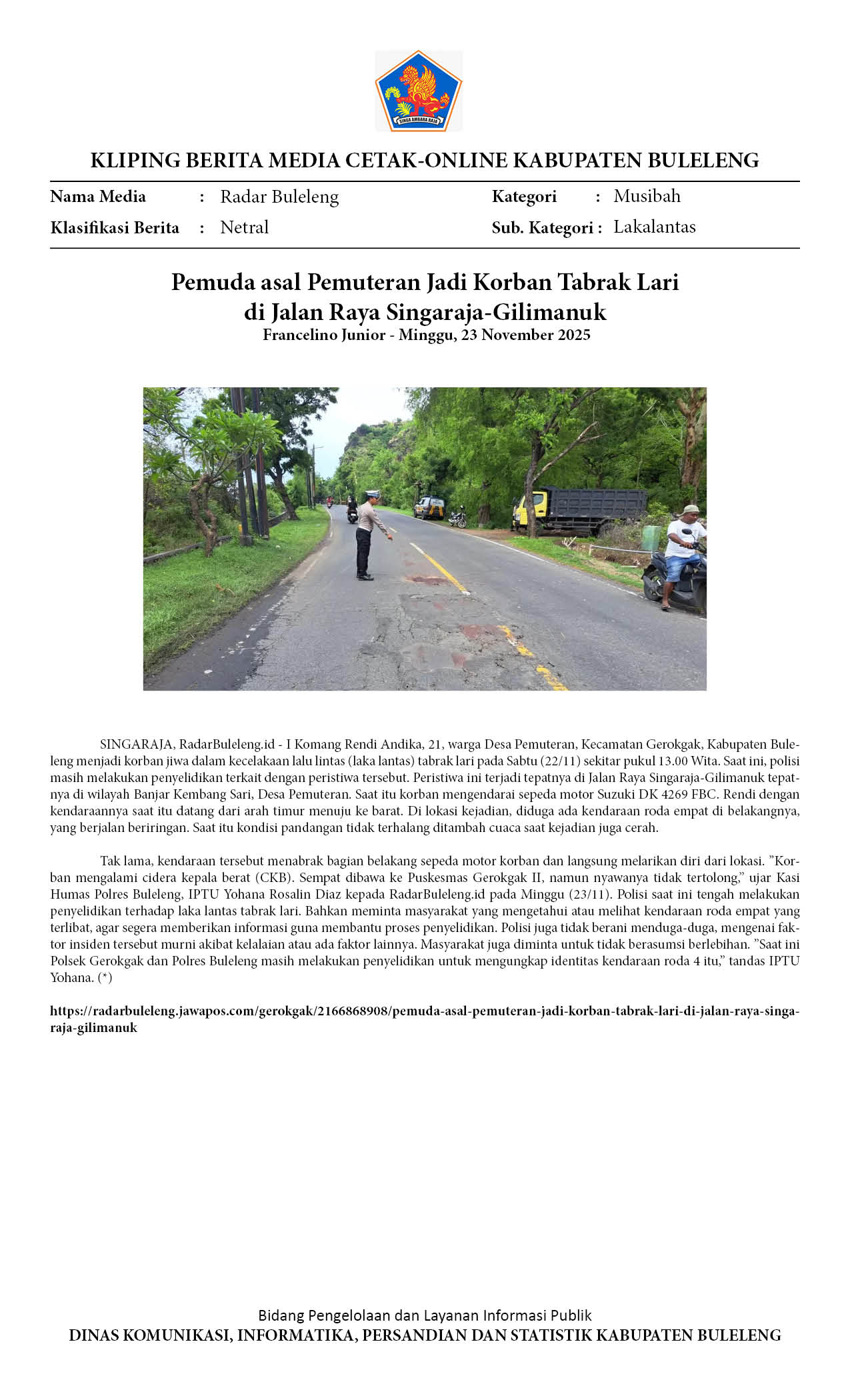 PEMUDA ASAL PEMUTERAN JADI KORBAN TABRAK LARI DI JALAN RAYA SINGARAJA-GILIMANUK