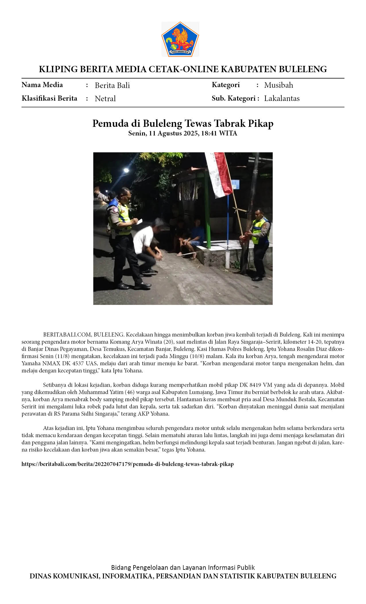 PEMUDA DI BULELENG TEWAS TABRAK PIKAP