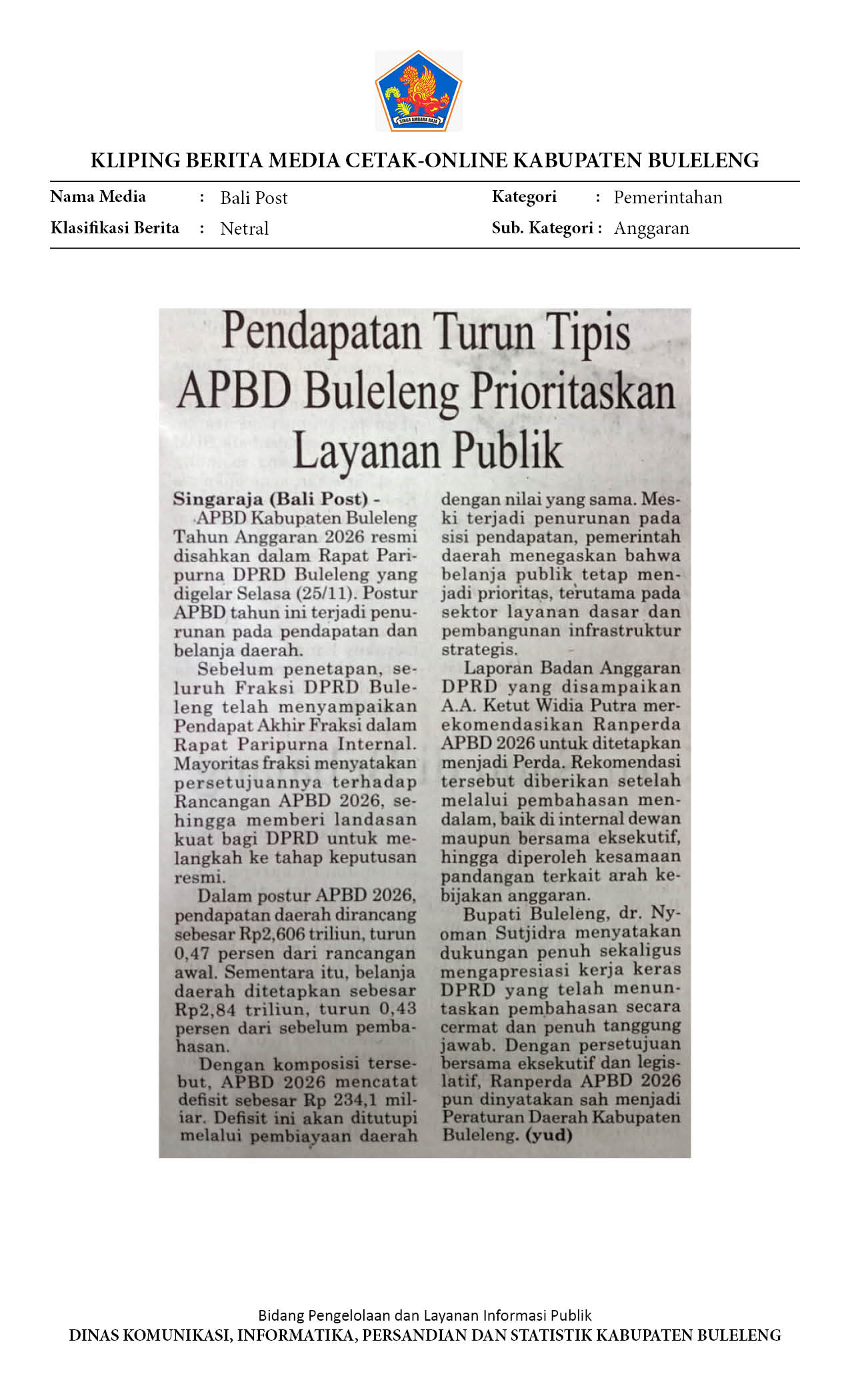 Pendapatan Turun Tipis APBD Buleleng Prioritaskan Layanan Publik