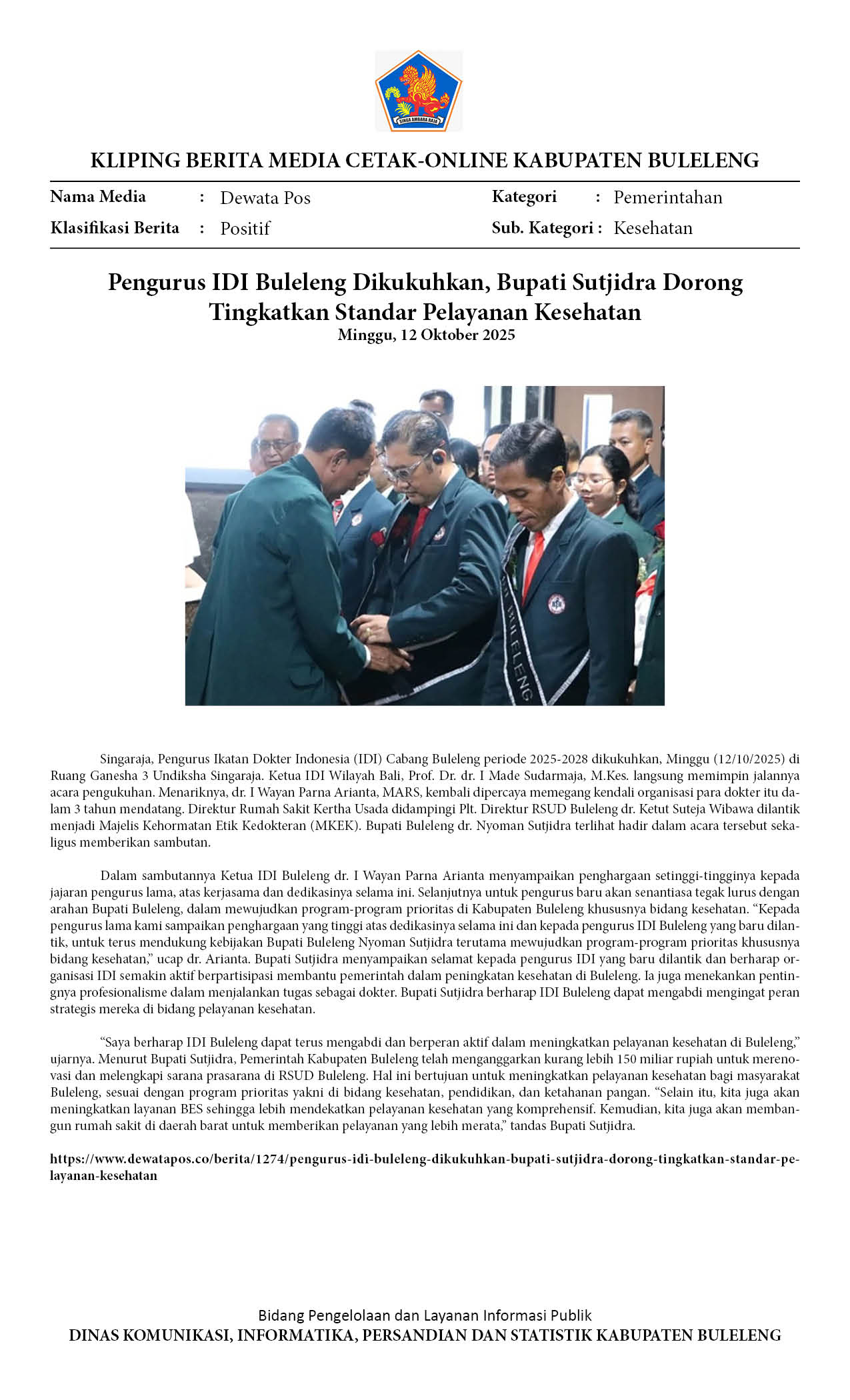 PENGURUS IDI BULELENG DIKUKUHKAN, BUPATI SUTJIDRA DORONG TINGKATKAN STANDAR PELAYANAN KESEHATAN