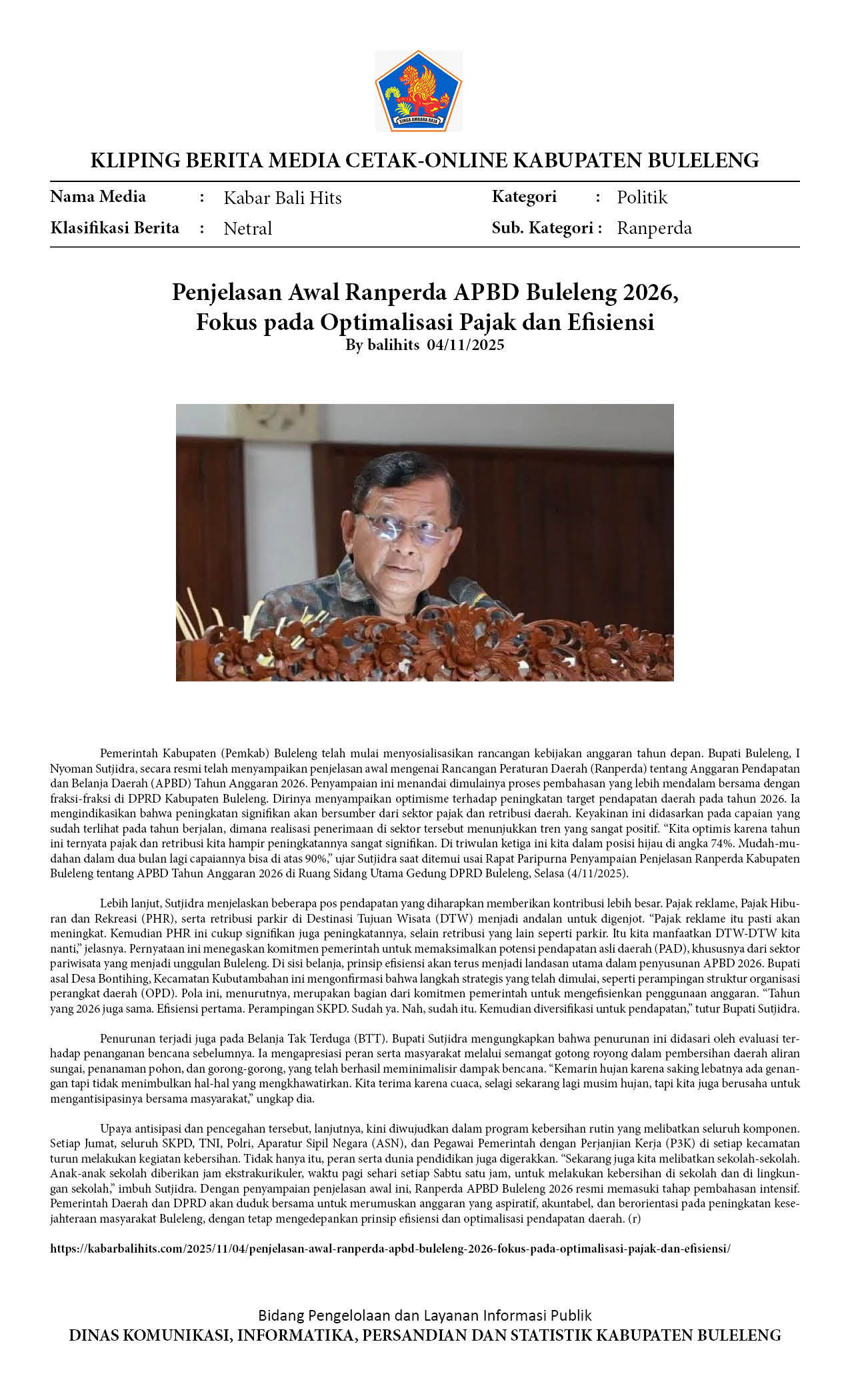 PENJELASAN AWAL RANPERDA APBD BULELENG 2026, FOKUS PADA OPTIMALISASI PAJAK DAN EFISIENSI
