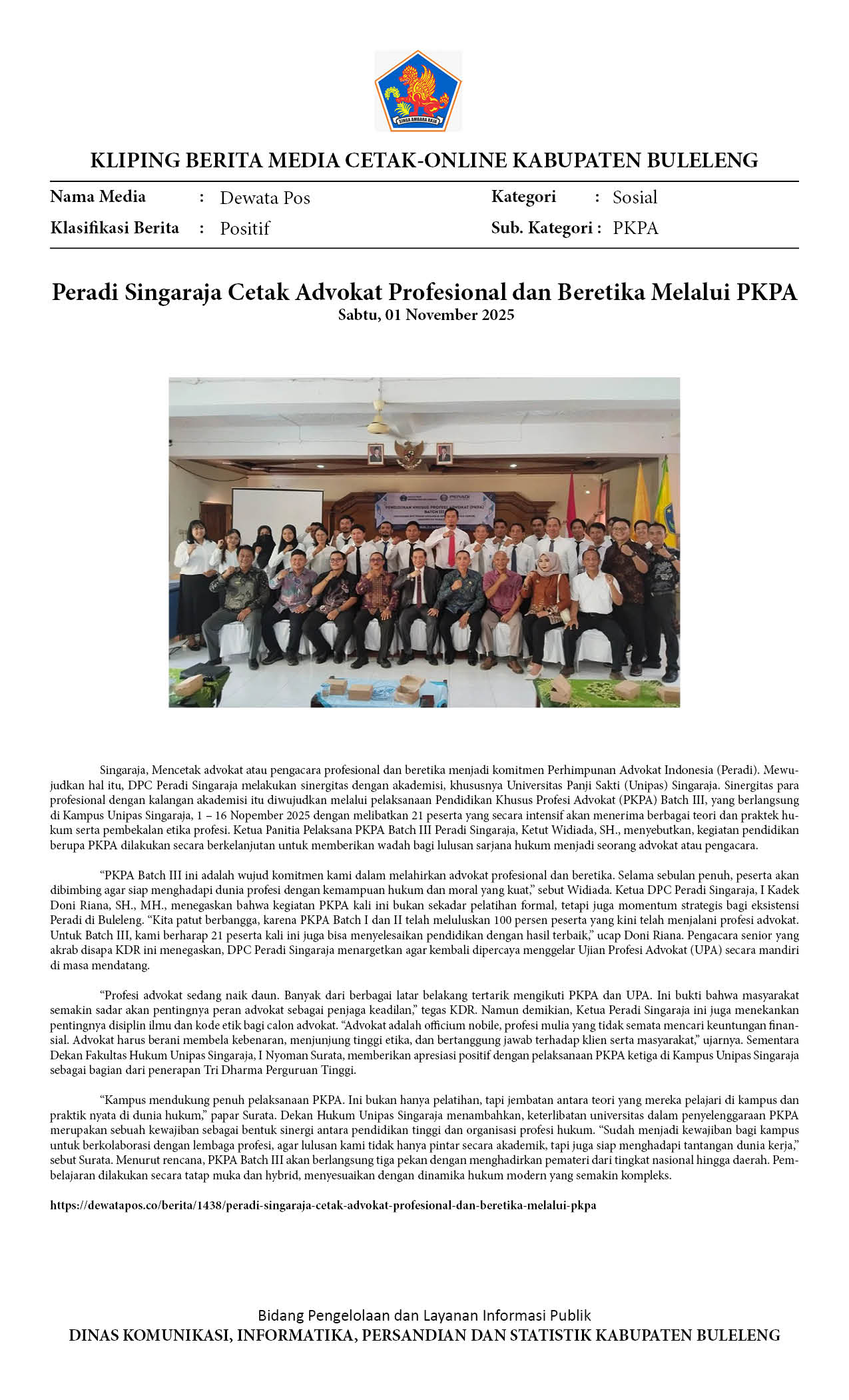 PERADI SINGARAJA CETAK ADVOKAT PROFESIONAL DAN BERETIKA MELALUI PKPA