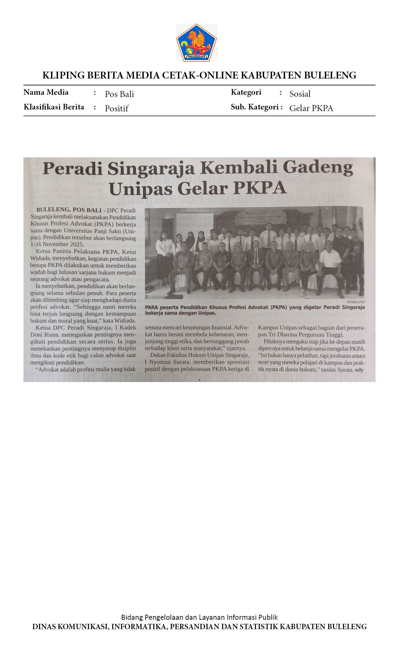 PERADI SINGARAJA KEMBALI GANDENG UNIPAS GELAR PKPA