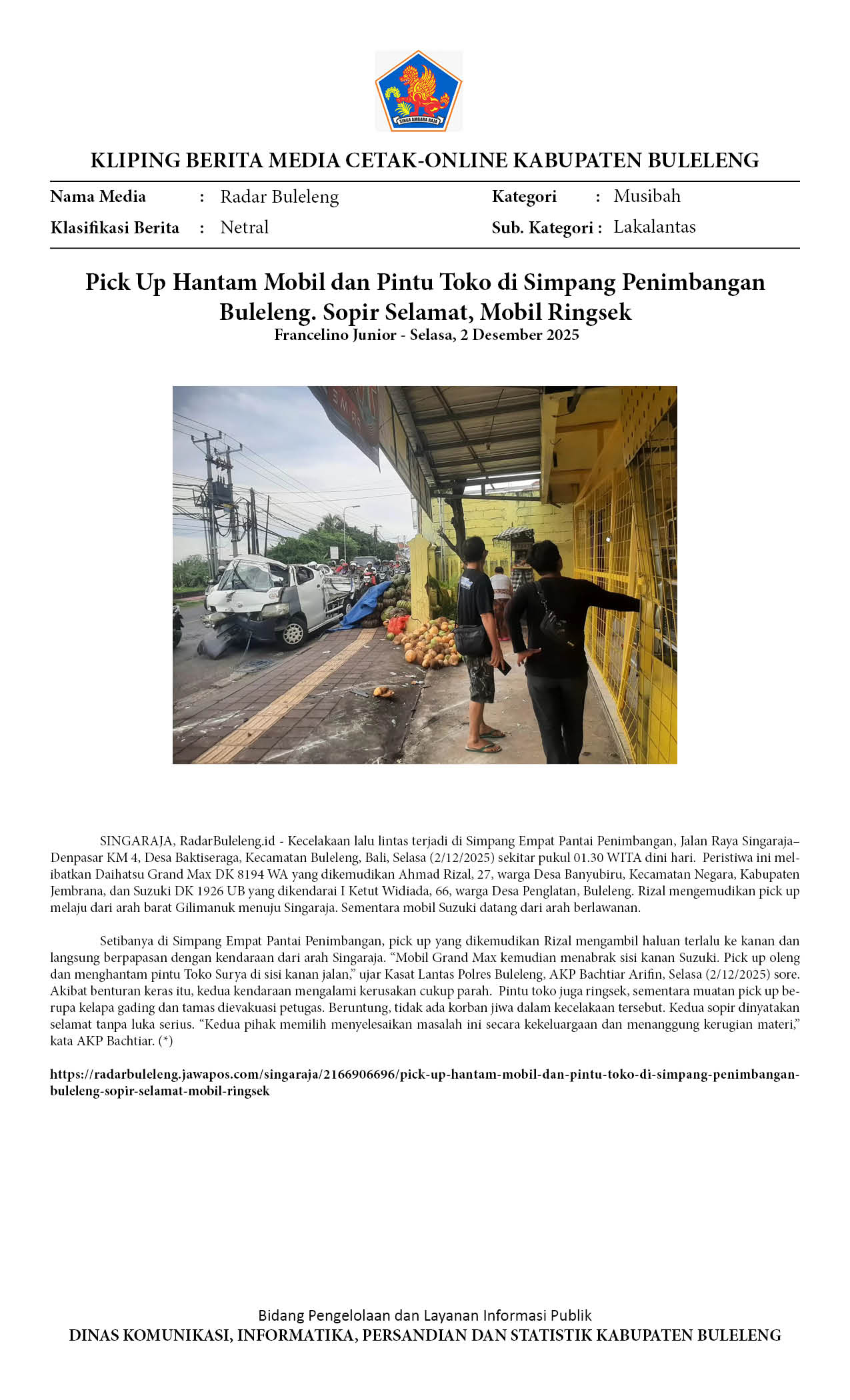 PICK UP HANTAM MOBIL DAN PINTU TOKO DI SIMPANG PENIMBANGAN BULELENG. SOPIR SELAMAT, MOBIL RINGSEK