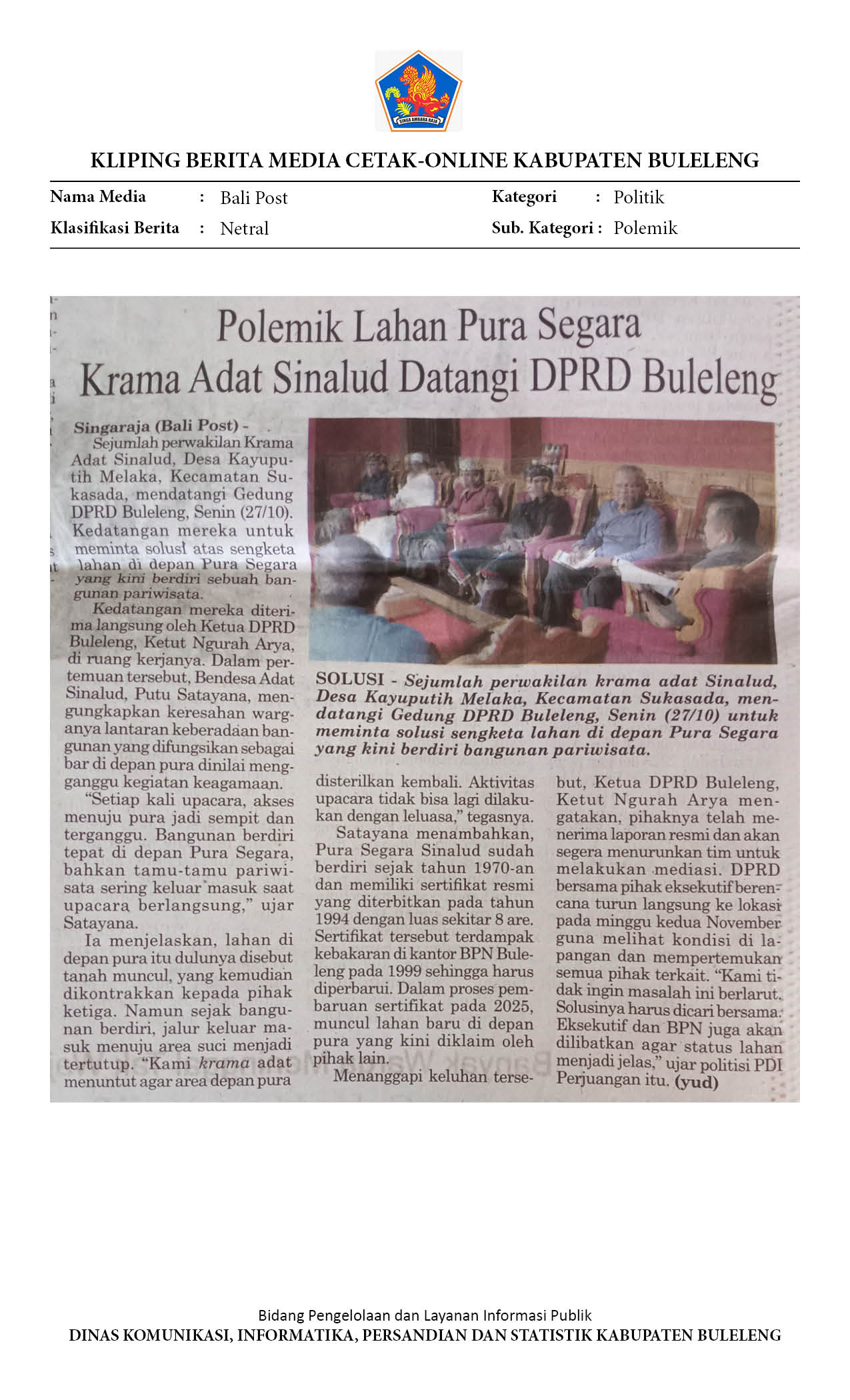 POLEMIK LAHAN PURA SEGARA KRAMA ADAT SINALUD DATANGI DPRD BULELENG