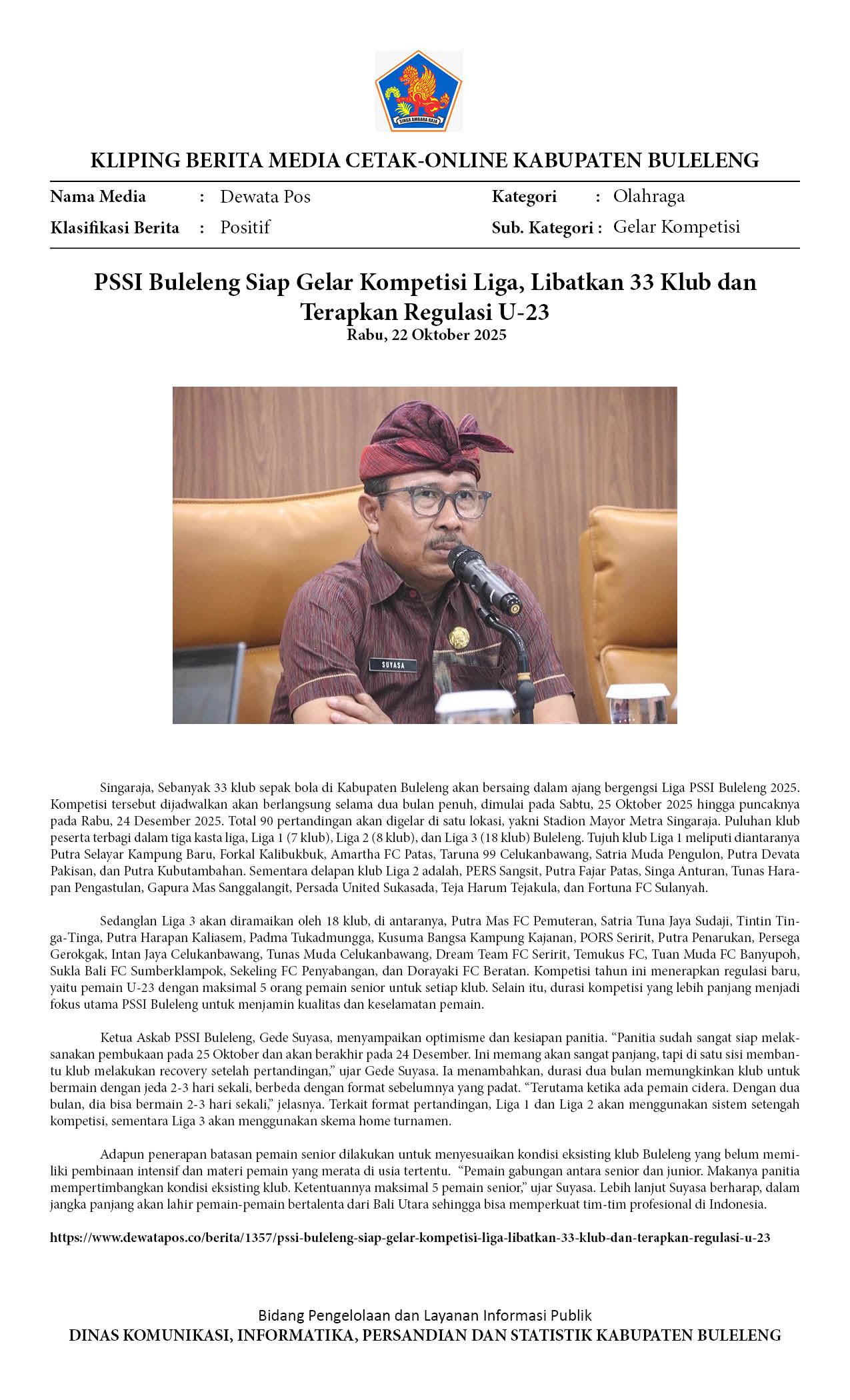 PSSI BULELENG SIAP GELAR KOMPETISI LIGA, LIBATKAN 33 KLUB DAN TERAPKAN REGULASI U-23