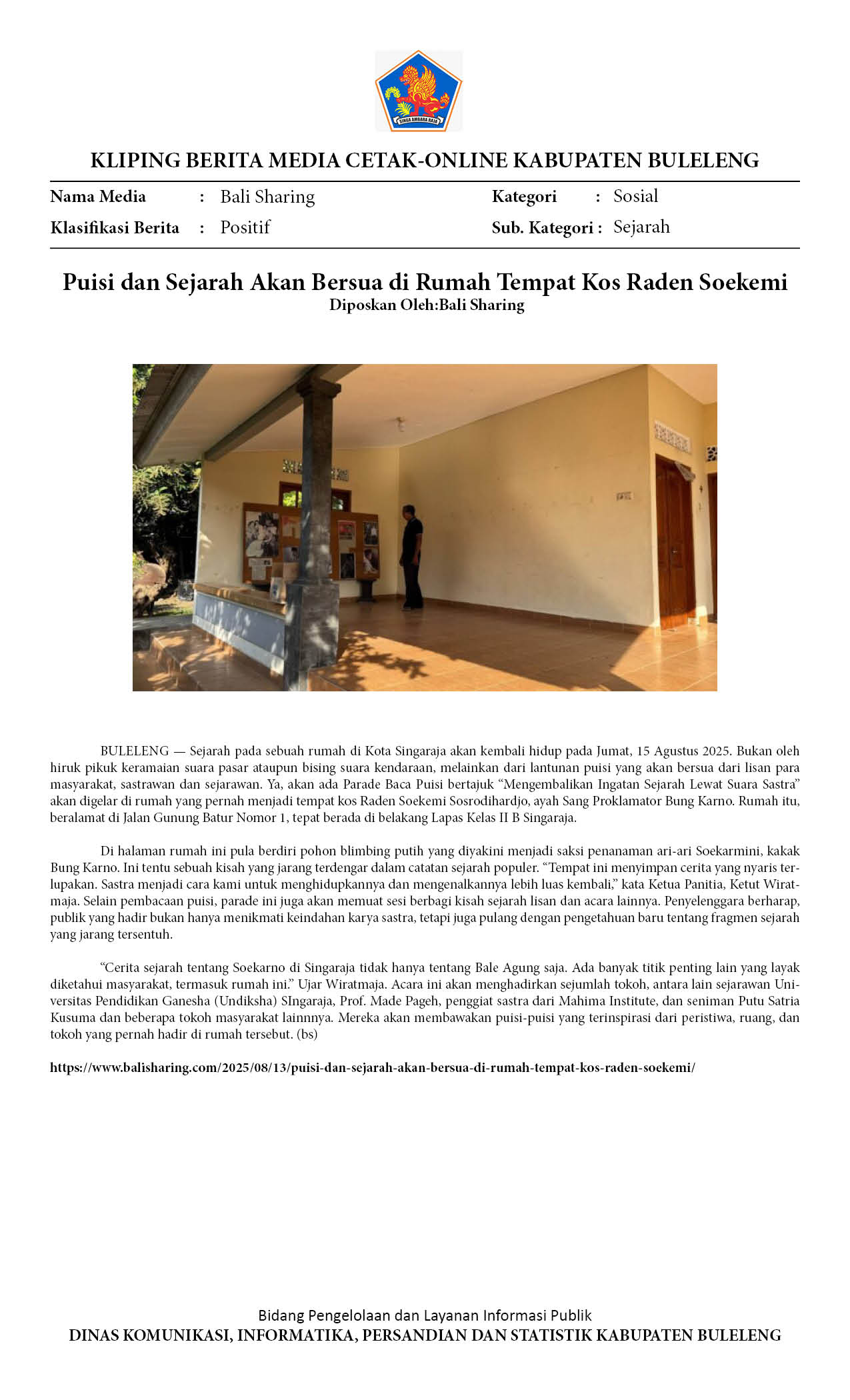 PUISI DAN SEJARAH AKAN BERSUA DI RUMAH TEMPAT KOS RADEN SOEKEMI