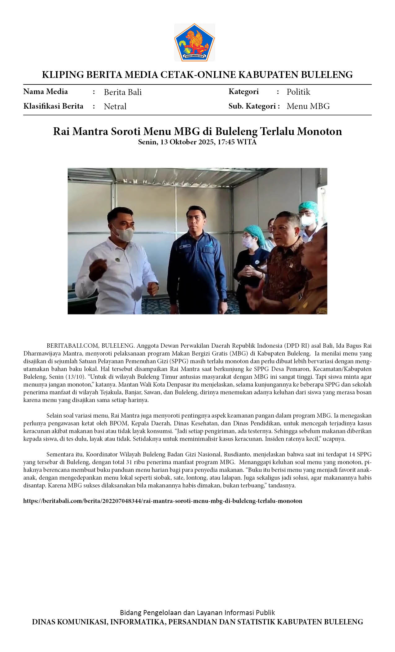 RAI MANTRA SOROTI MENU MBG DI BULELENG TERLALU MONOTON