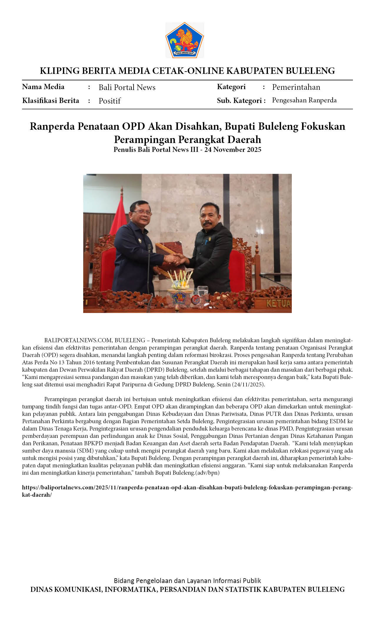 RANPERDA PENATAAN OPD AKAN DISAHKAN, BUPATI BULELENG FOKUSKAN PERAMPINGAN PERANGKAT DAERAH