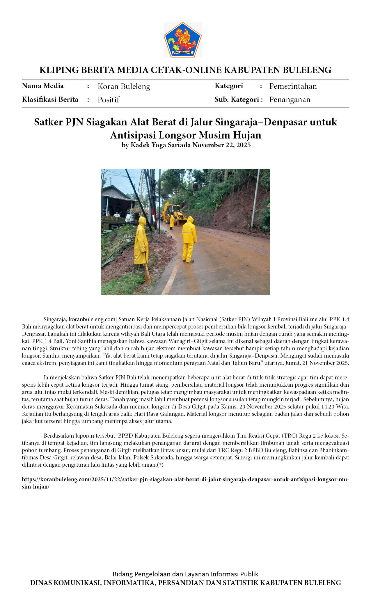 SATKER PJN SIAGAKAN ALAT BERAT DI JALUR SINGARAJA–DENPASAR UNTUK ANTISIPASI LONGSOR MUSIM HUJAN