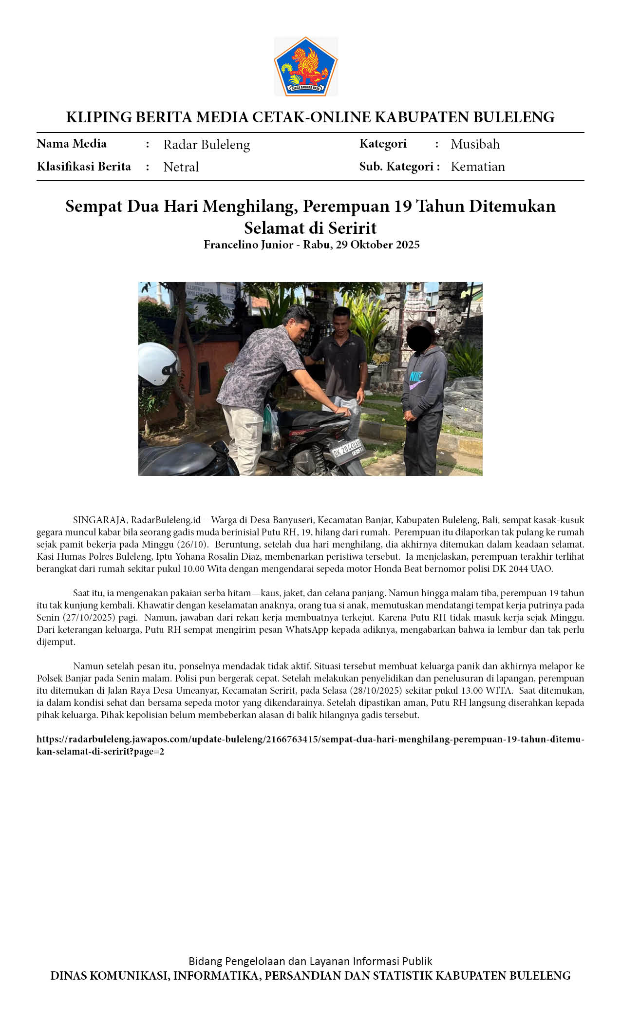 Sempat Dua Hari Menghilang, Perempuan 19 Tahun Ditemukan Selamat di Seririt