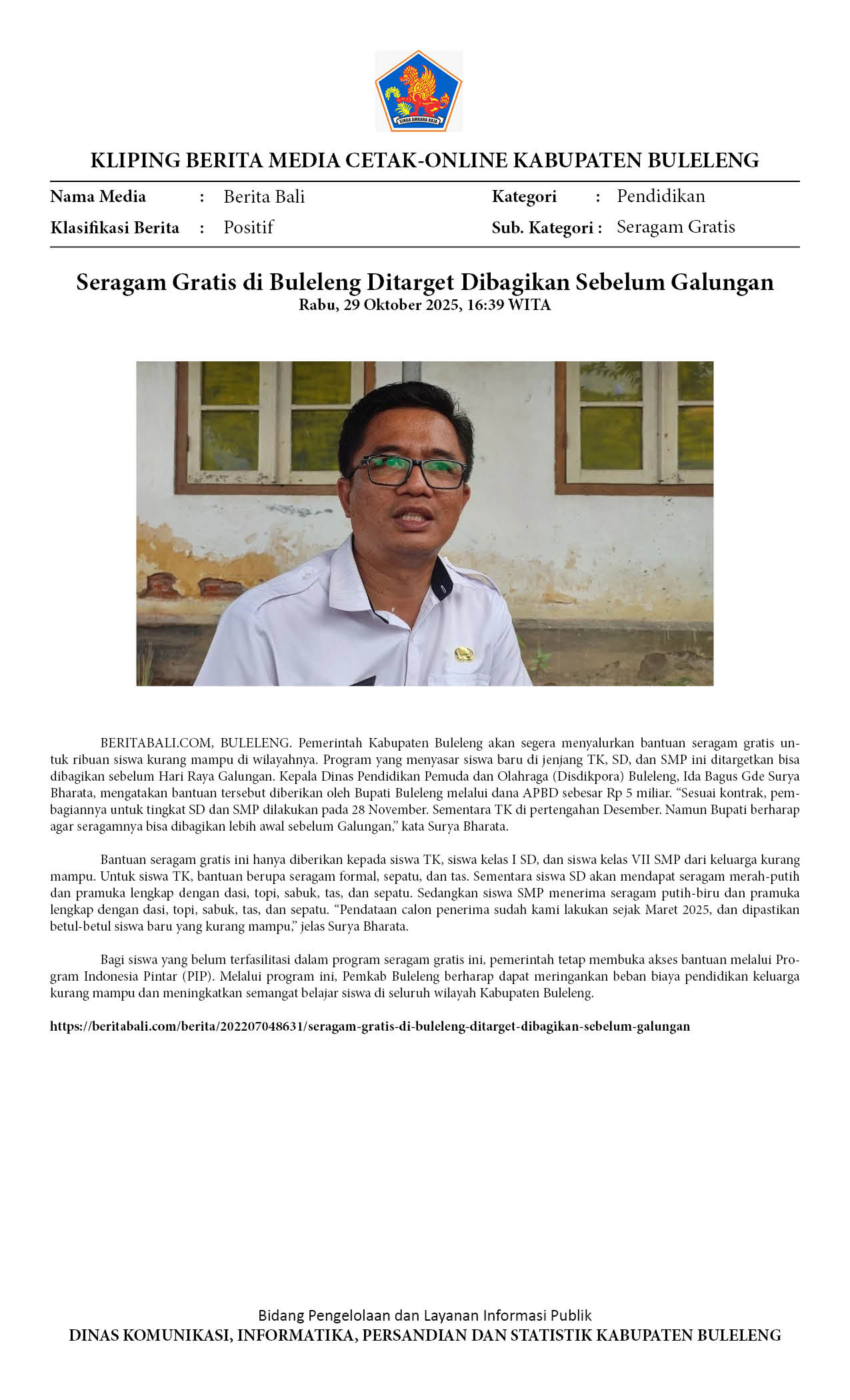 SERAGAM GRATIS DI BULELENG DITARGET DIBAGIKAN SEBELUM GALUNGAN