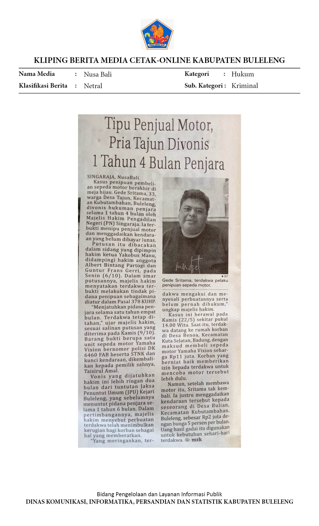 TIPU PENJUAL MOTOR, PRIA TAJUN DIVONIS 1 TAHUN 4 BULAN PENJARA