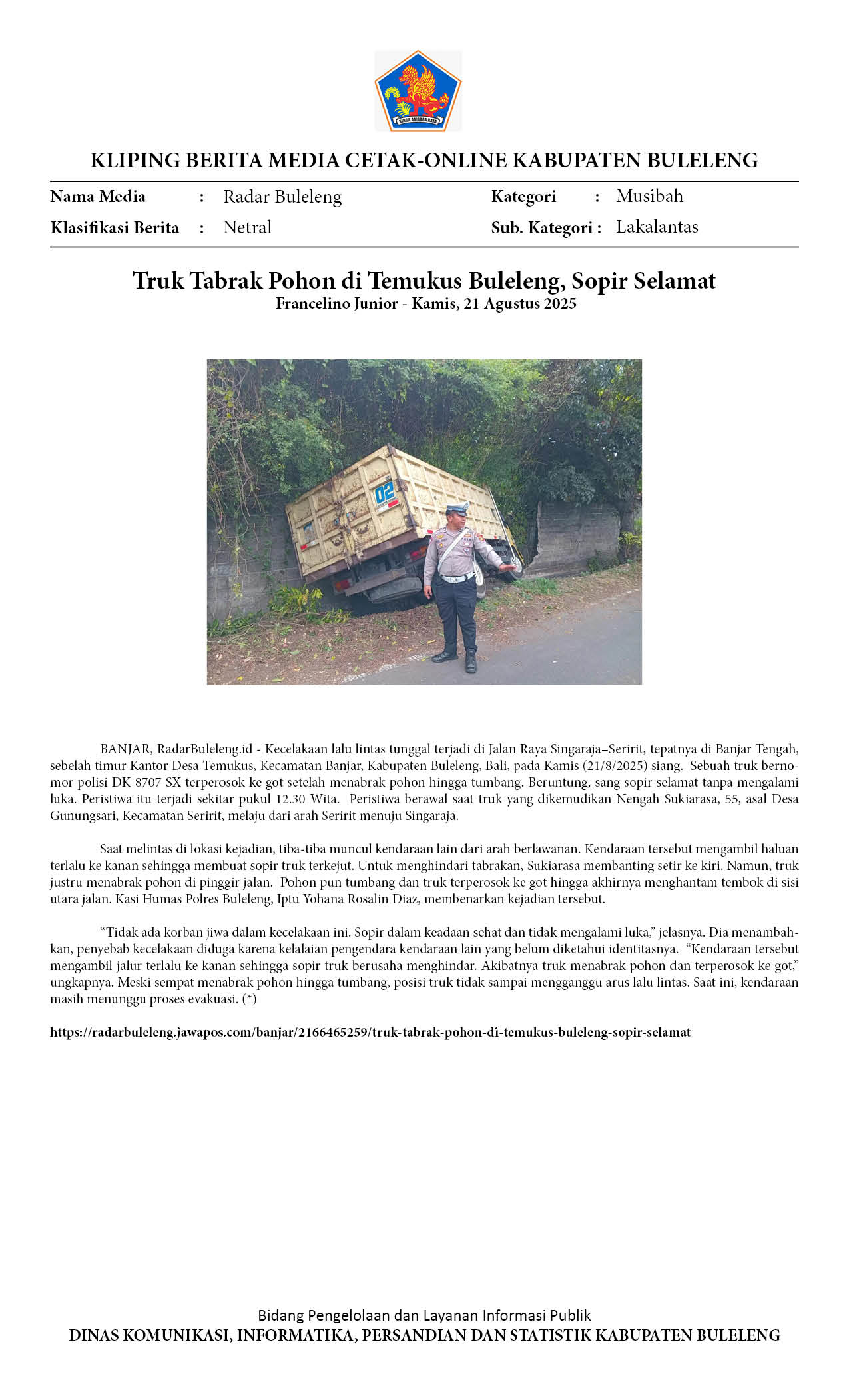 Truk Tabrak Pohon di Temukus Buleleng, Sopir Selamat