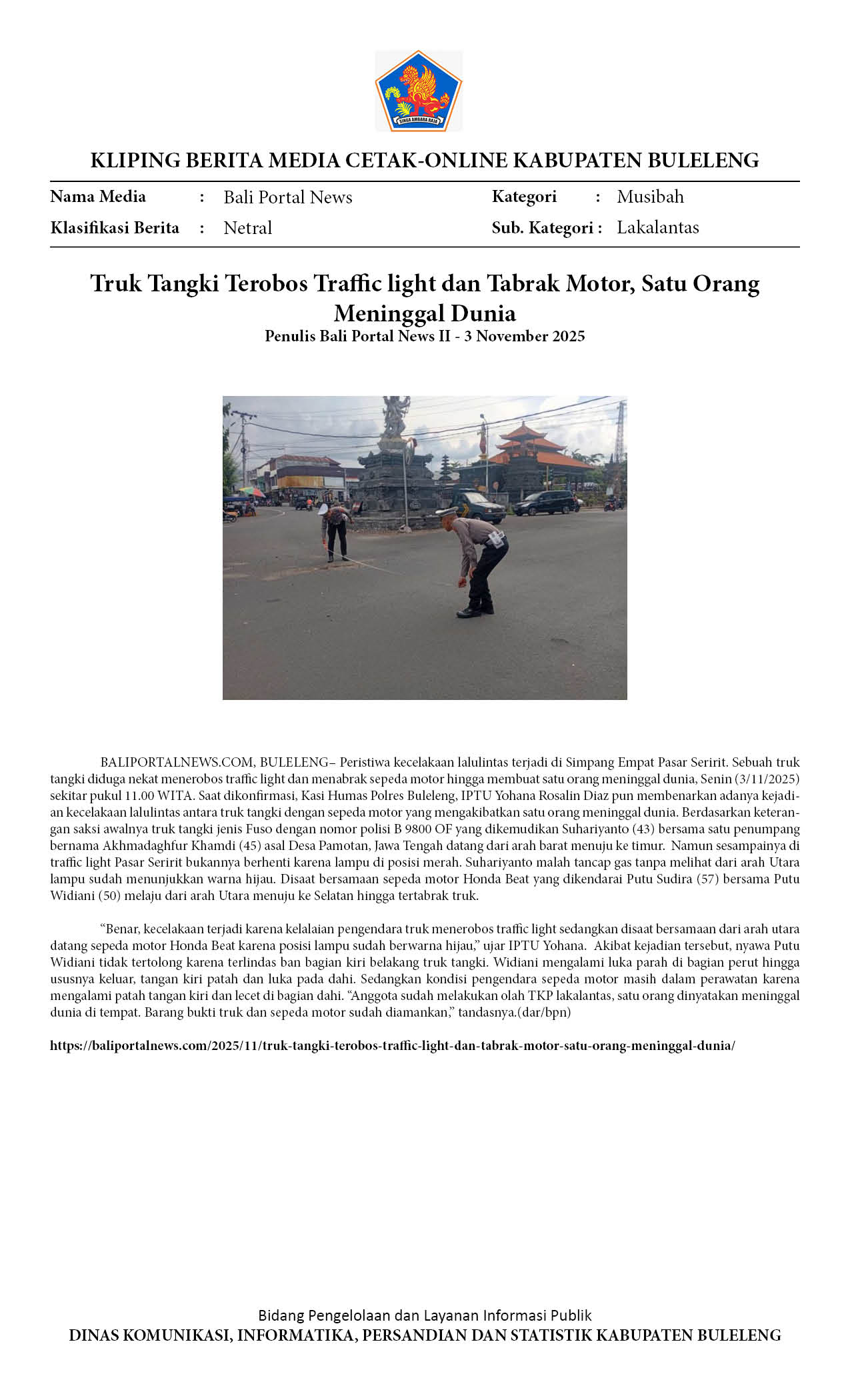 TRUK TANGKI TEROBOS TRAFFIC LIGHT DAN TABRAK MOTOR, SATU ORANG MENINGGAL DUNIA