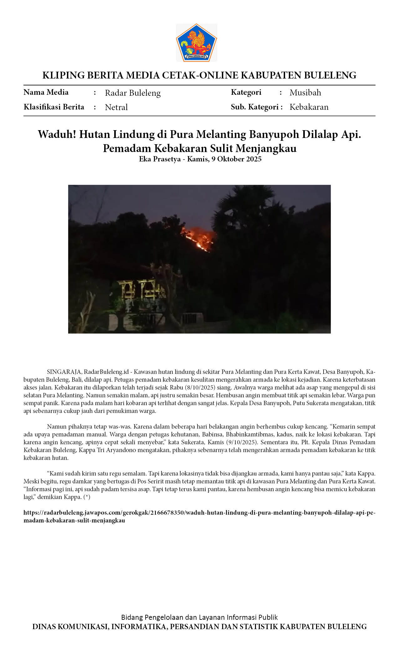 Waduh! Hutan Lindung di Pura Melanting Banyupoh Dilalap Api. Pemadam Kebakaran Sulit Menjangkau