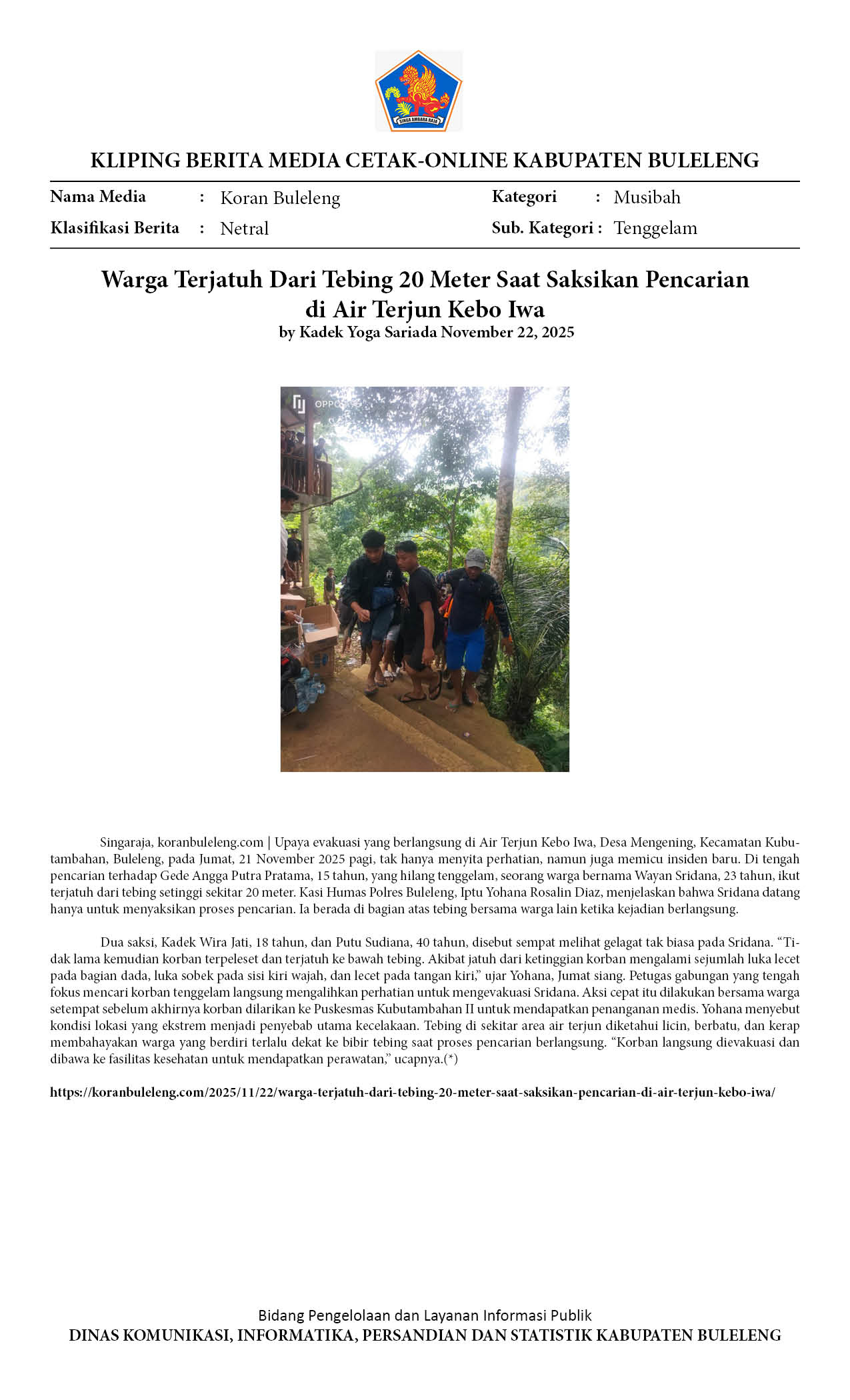 Warga Terjatuh Dari Tebing 20 Meter Saat Saksikan Pencarian di Air Terjun Kebo Iwa