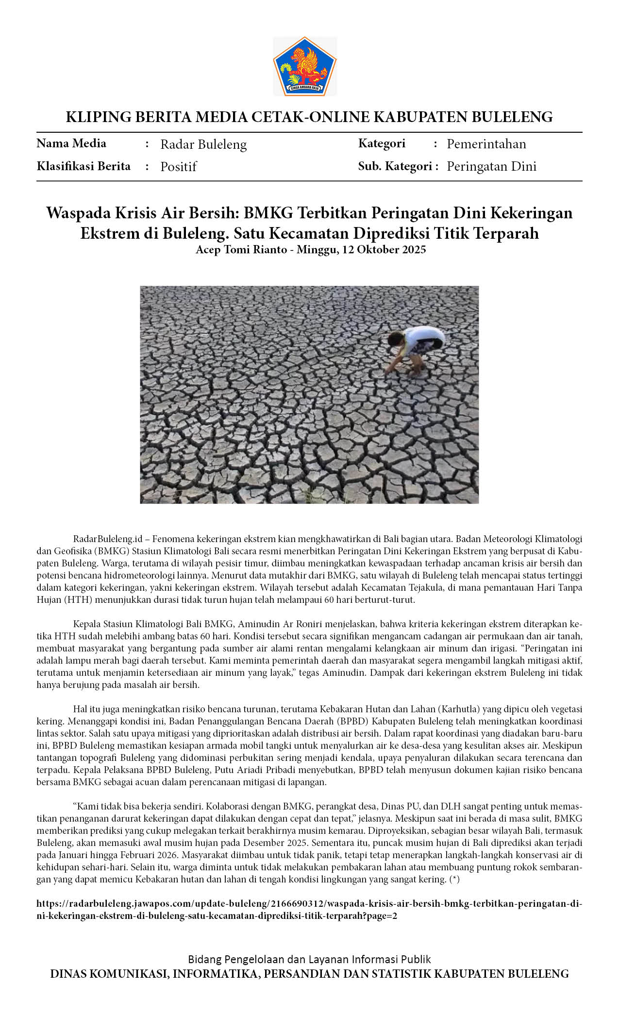 WASPADA KRISIS AIR BERSIH: BMKG TERBITKAN PERINGATAN DINI KEKERINGAN EKSTREM DI BULELENG. SATU KECAMATAN DIPREDIKSI TITIK TERPARAH