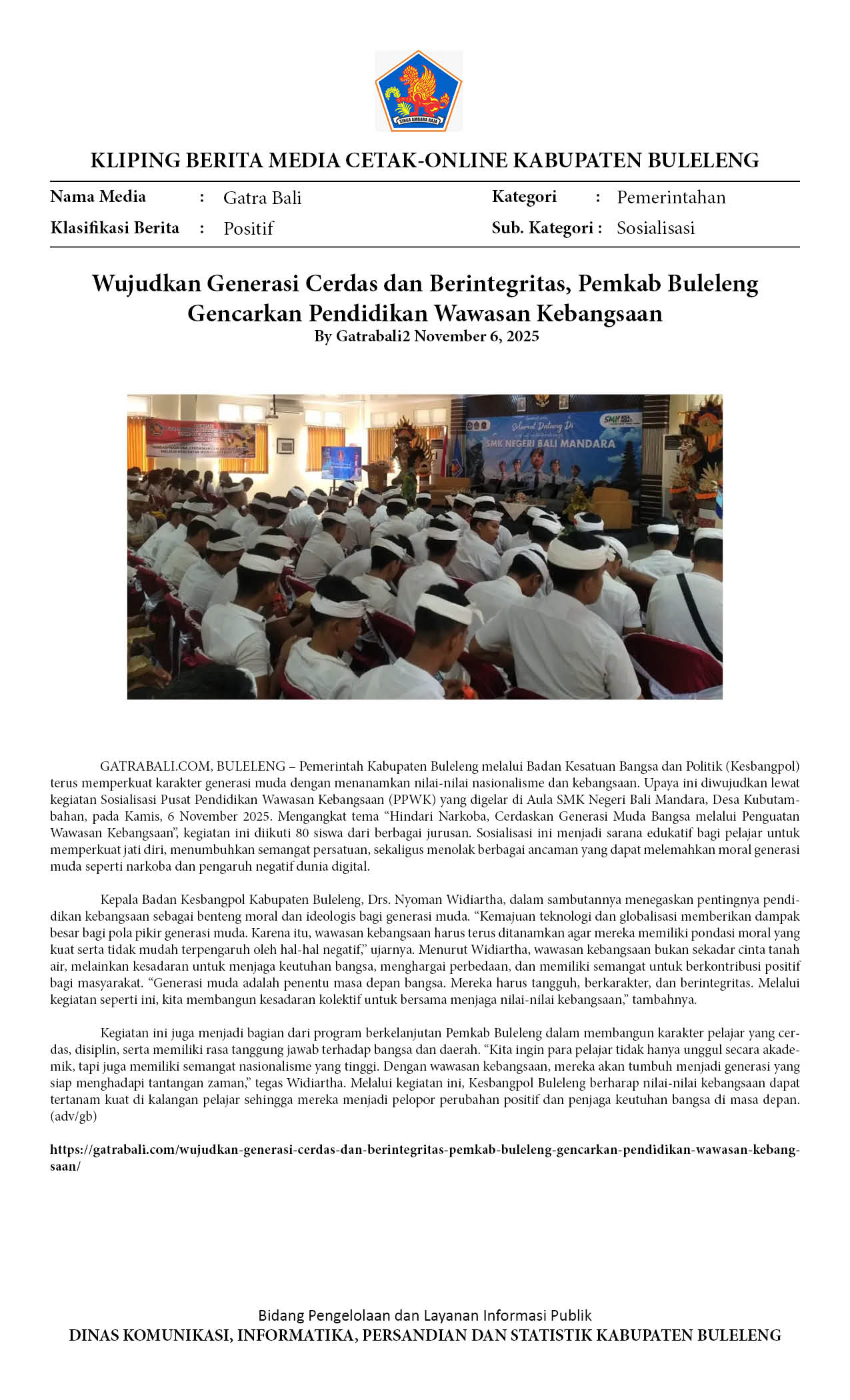 WUJUDKAN GENERASI CERDAS DAN BERINTEGRITAS, PEMKAB BULELENG GENCARKAN PENDIDIKAN WAWASAN KEBANGSAAN