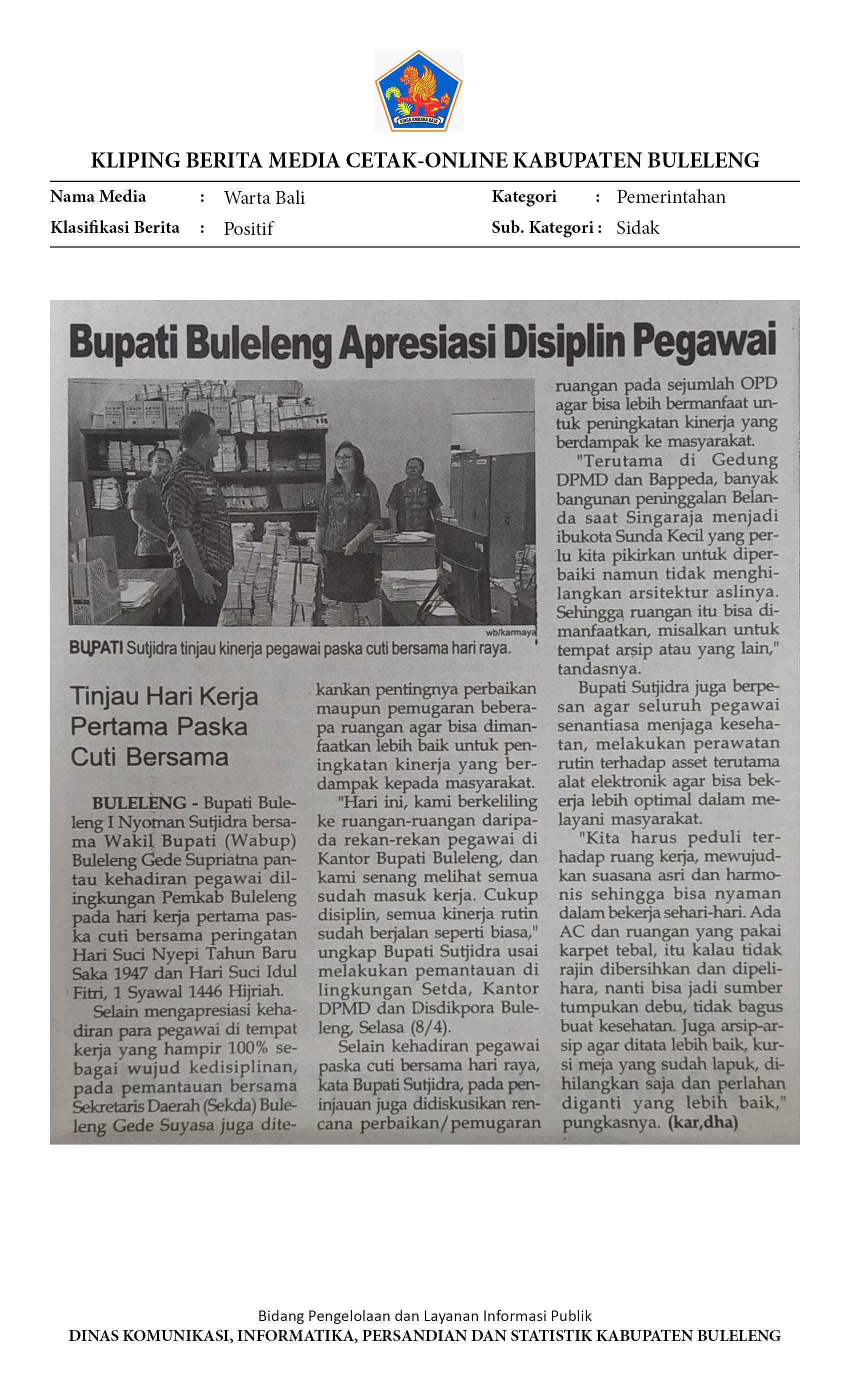 BUPATI BULELENG TINJAU KINERJA PEGAWAI DI HARI PERTAMA KERJA PASCA LIBUR HARI RAYA