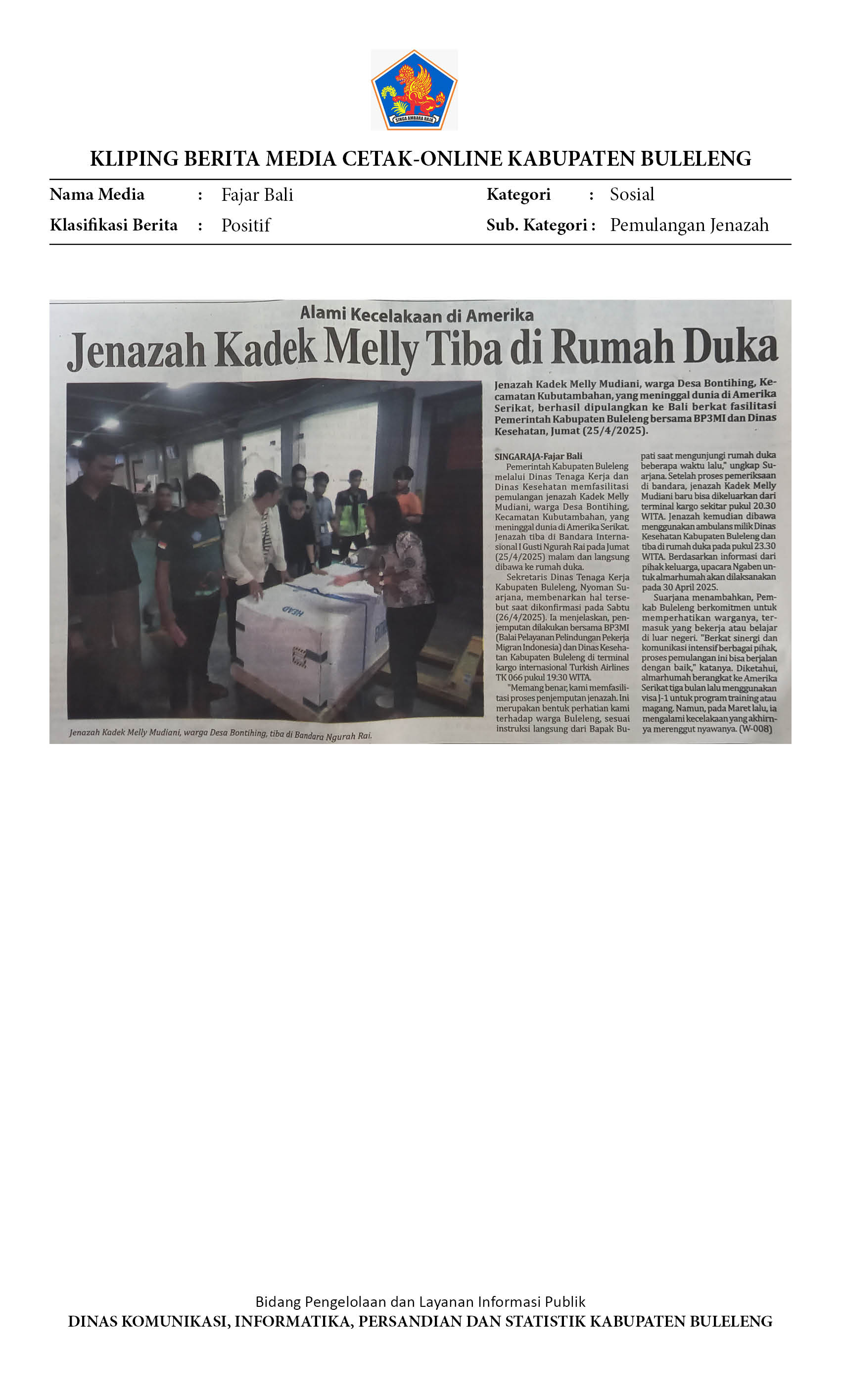 UPAYA SIGAP PEMKAB BULELENG PULANGKAN JENAZAH KADEK MELLY YANG MENINGGAL DI AMERIKA SERIKAT