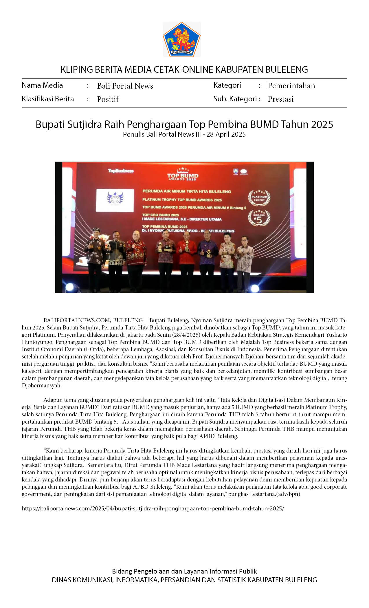 BUPATI SUTJIDRA RAIH PENGHARGAAN TOP PEMBINA BUMD TAHUN 2025