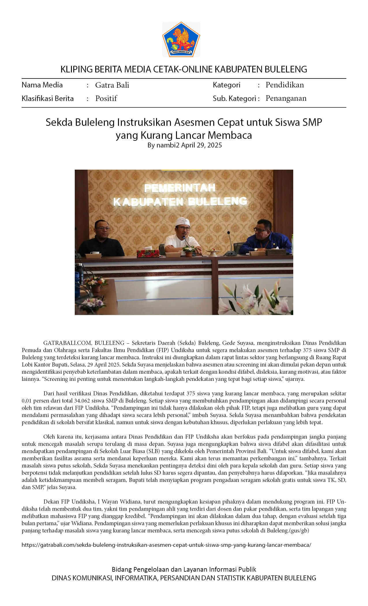ATASI SISWA KURANG LANCAR MEMBACA, SEKDA SUYASA INSTRUKSIKAN DISDIK DAN FIP UNDIKSHA SEGERA LAKUKAN SCREENING