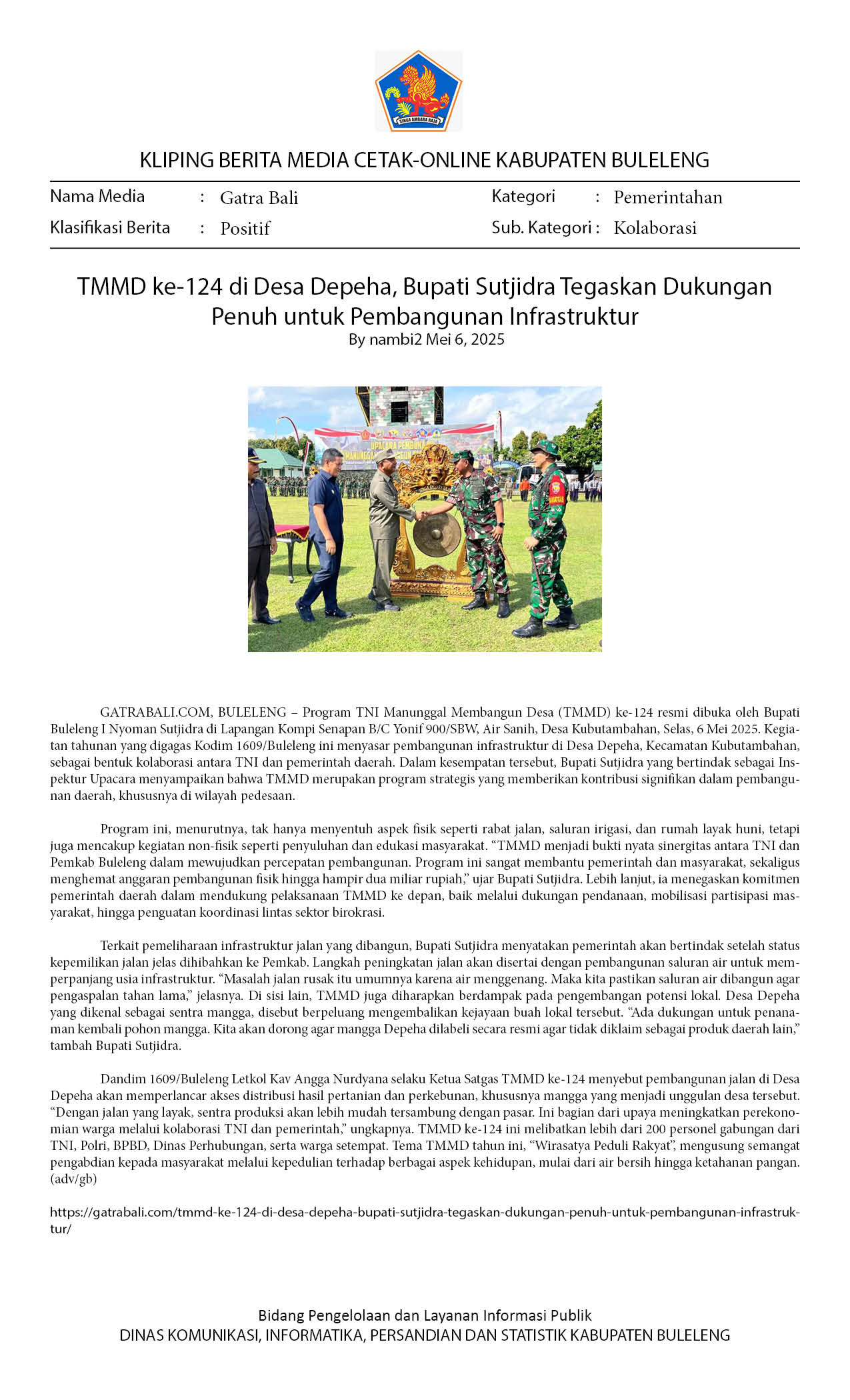 BUPATI BULELENG BUKA TMMD KE-124 TEKANKAN PERLINDUNGAN MANGGA DESA DEPEHA