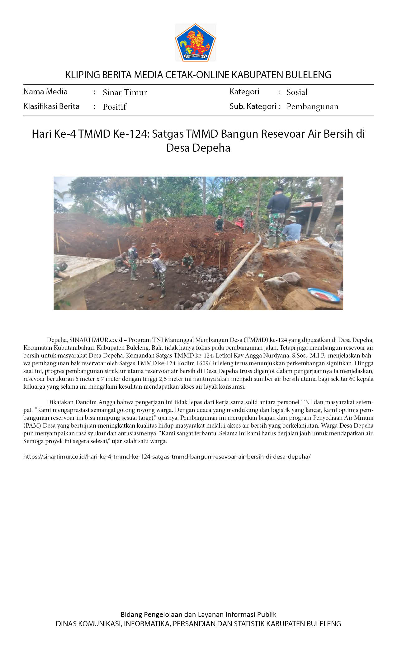 HARI KE-7 TMMD KE-124: PEMBANGUNAN RESEVOAR CAPAI 21 PERSEN, SATGAS KEJAR TARGET PENYELESAIAN