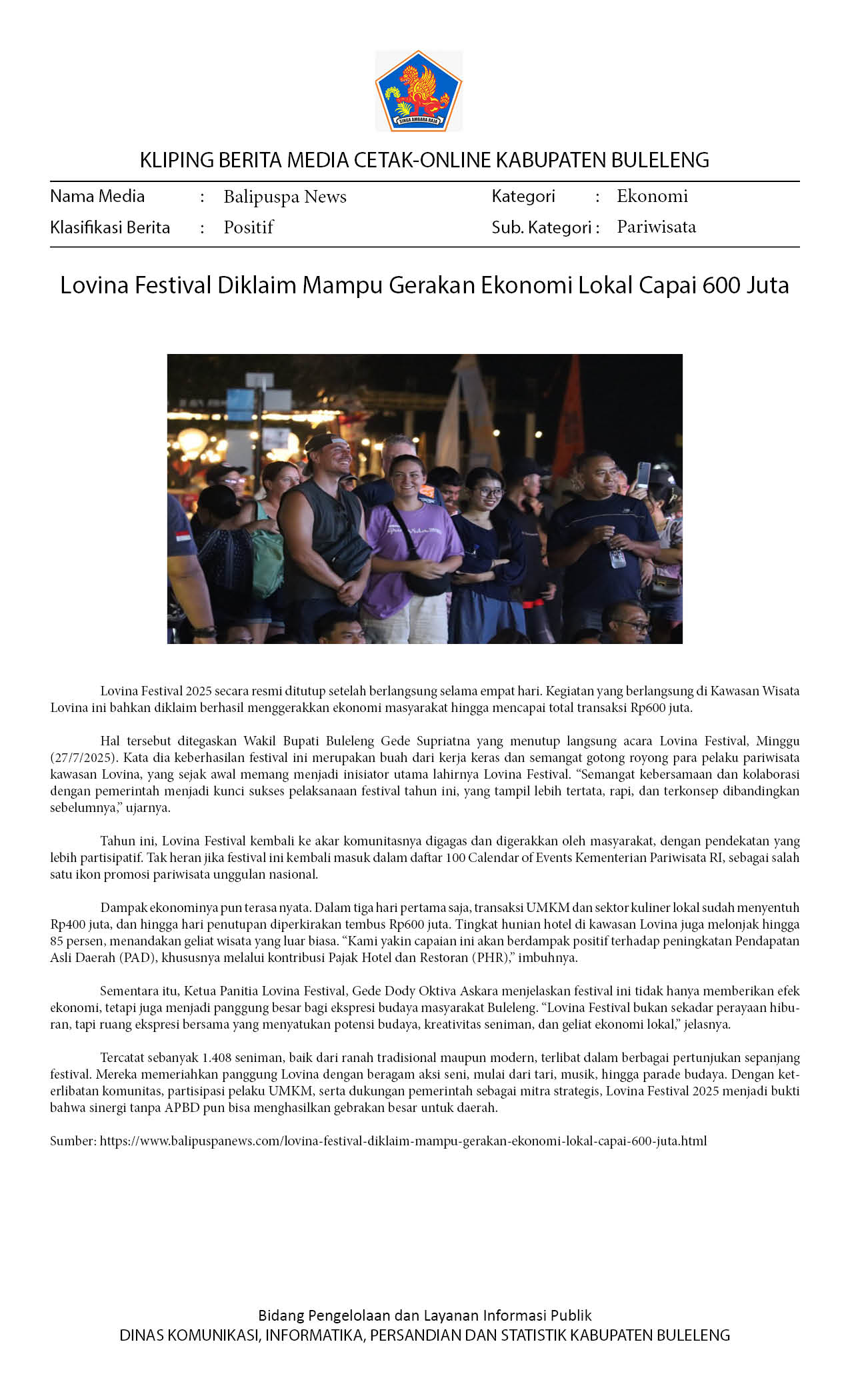 LOVINA FESTIVAL DIKLAIM MAMPU GERAKAN EKONOMI LOKAL CAPAI 600 JUTA