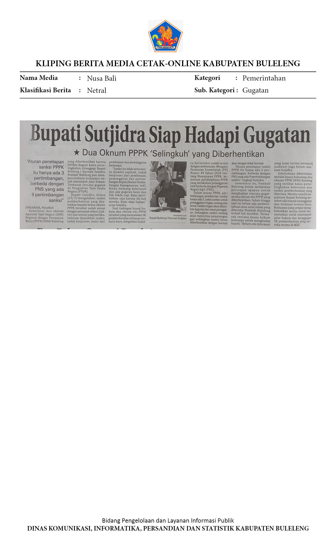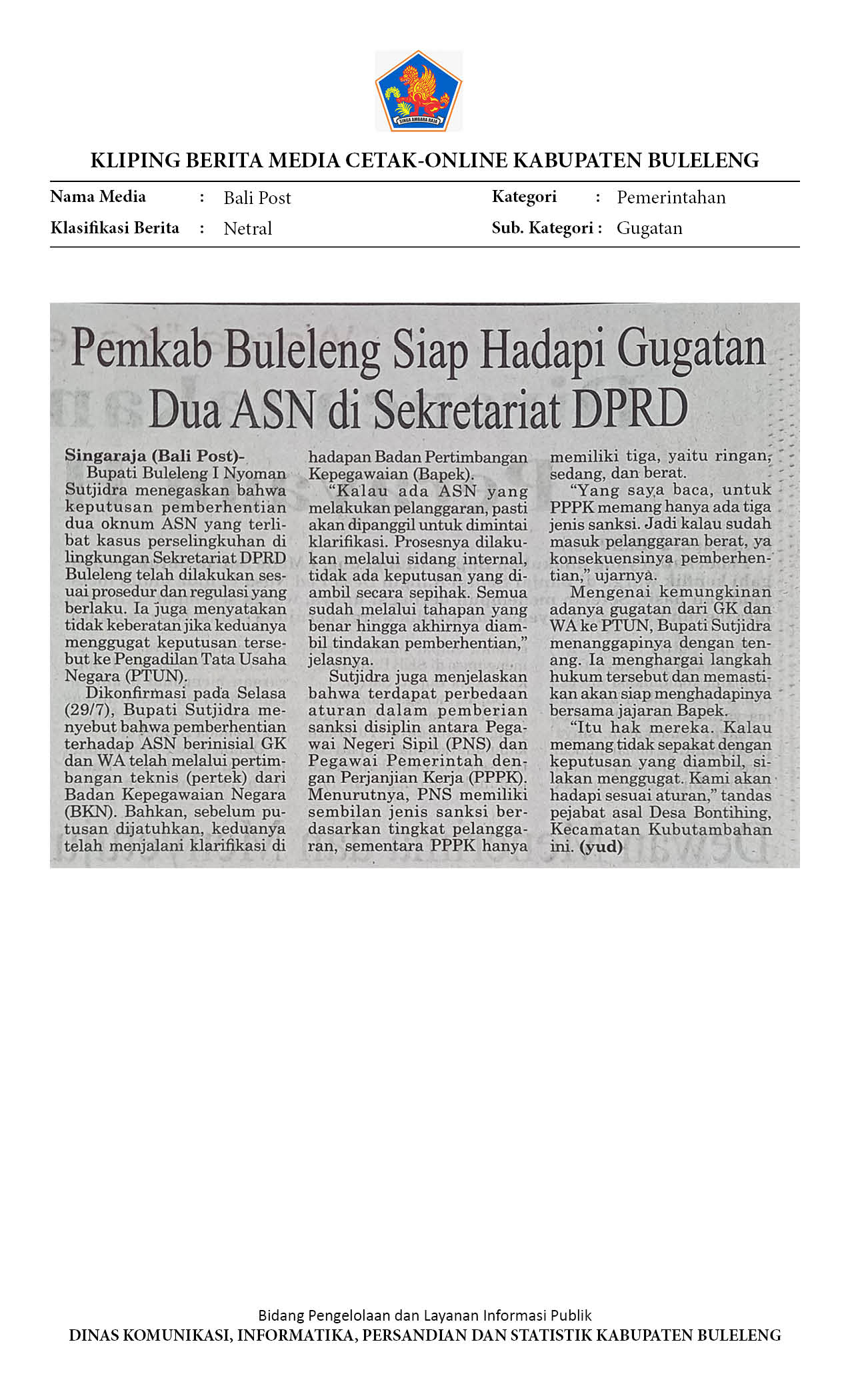 PEMKAB BULELENG SIAP HADAPI GUGATAN DUA ASN DI SEKRETARIAT DPRD