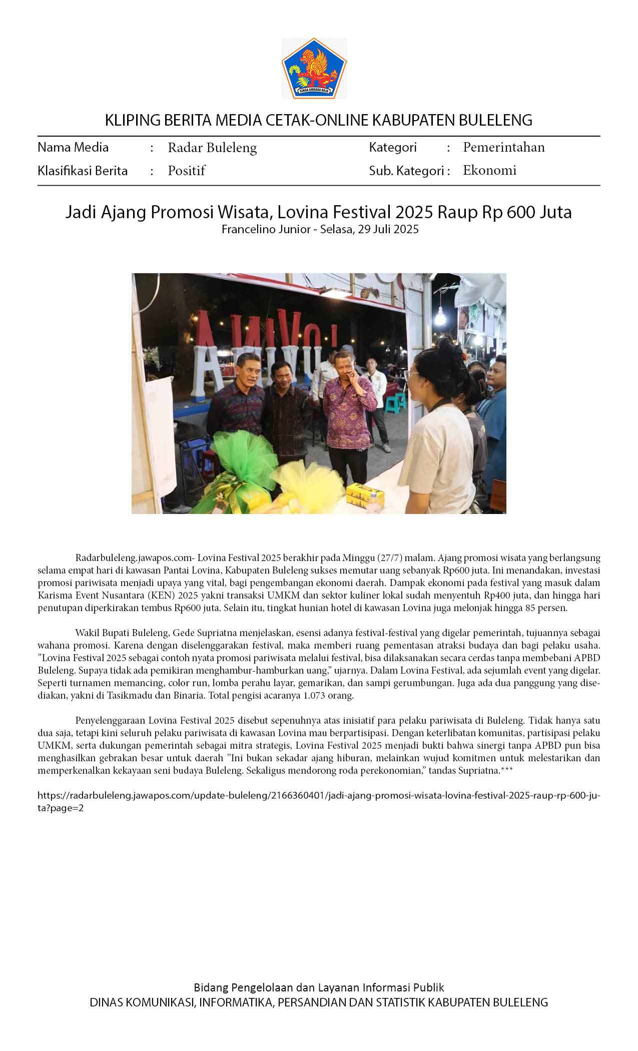 JADI AJANG PROMOSI WISATA, LOVINA FESTIVAL 2025 RAUP RP 600 JUTA