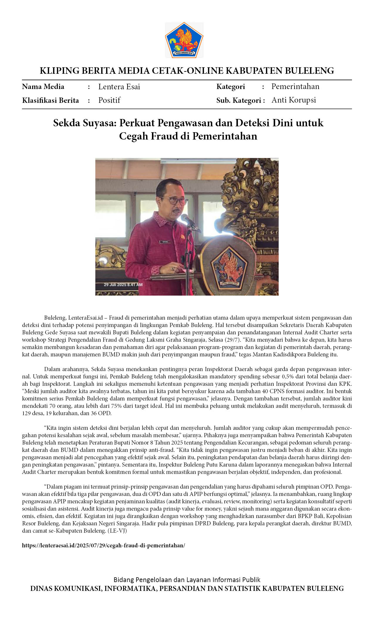 SEKDA SUYASA: PERKUAT PENGAWASAN DAN DETEKSI DINI UNTUK CEGAH FRAUD DI PEMERINTAHAN