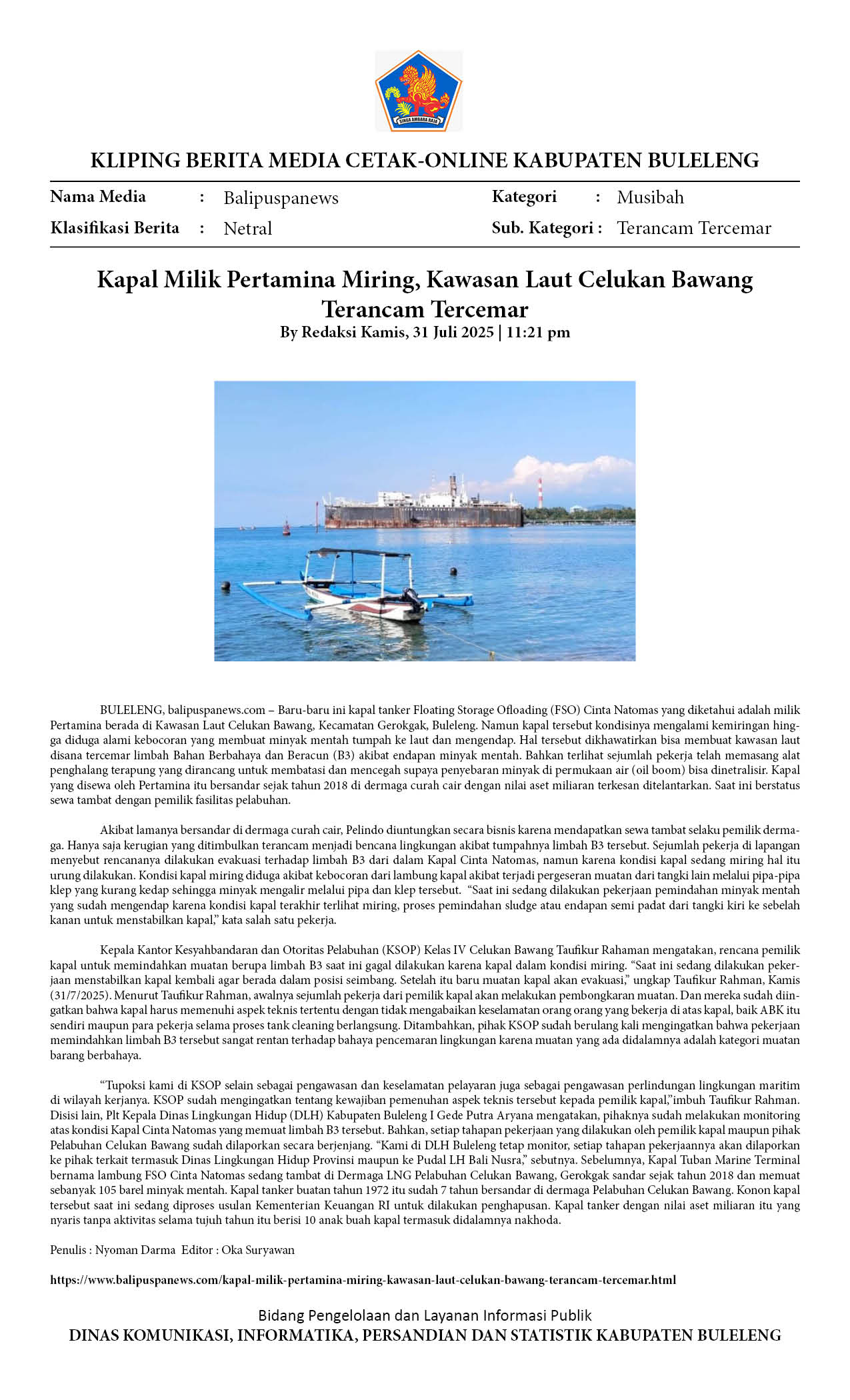 KAPAL MILIK PERTAMINA MIRING, KAWASAN LAUT CELUKAN BAWANG TERANCAM TERCEMAR