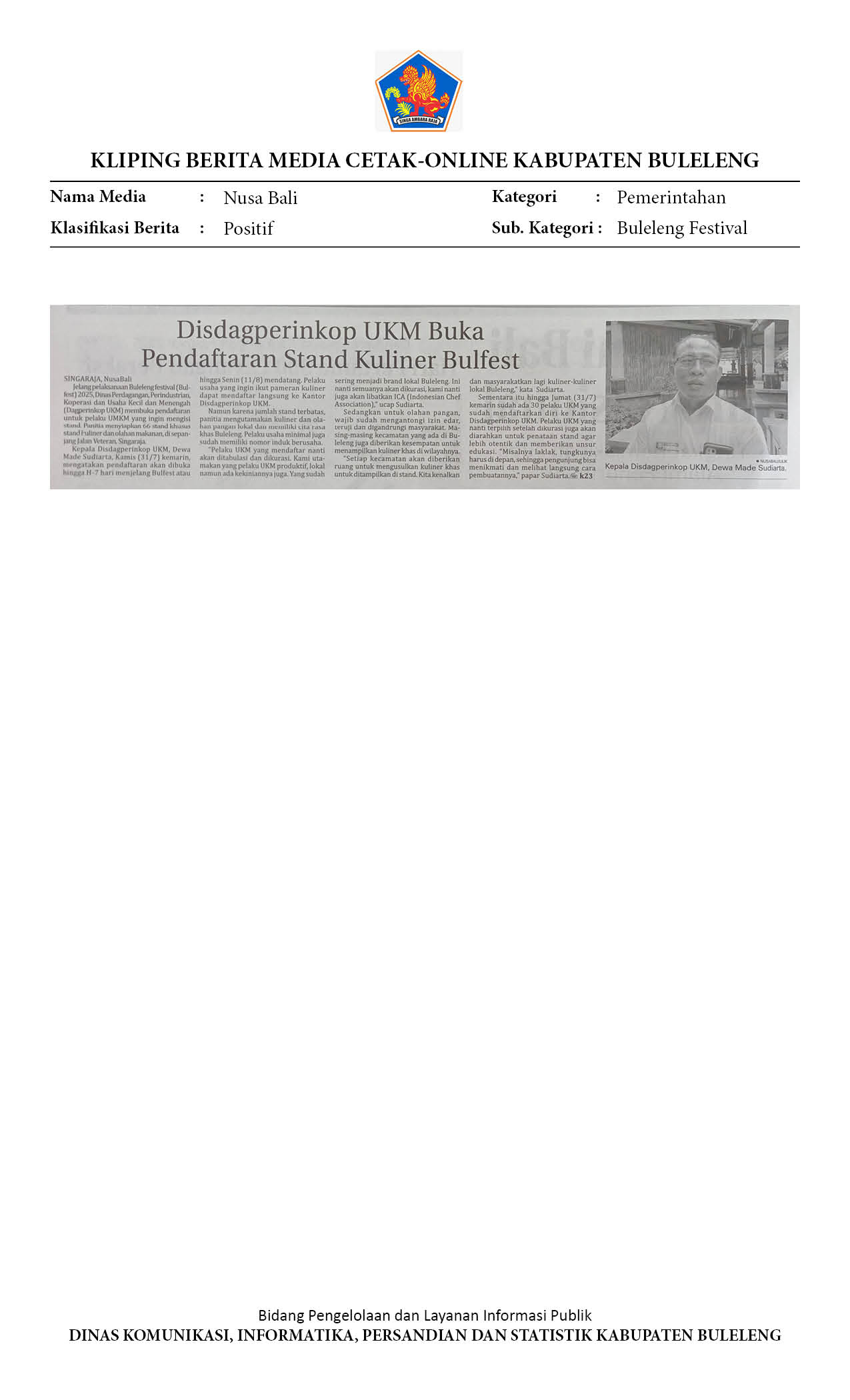 DISDAGPERINKOP UKM BUKA PENDAFTARAN STAND KULINER BULFEST