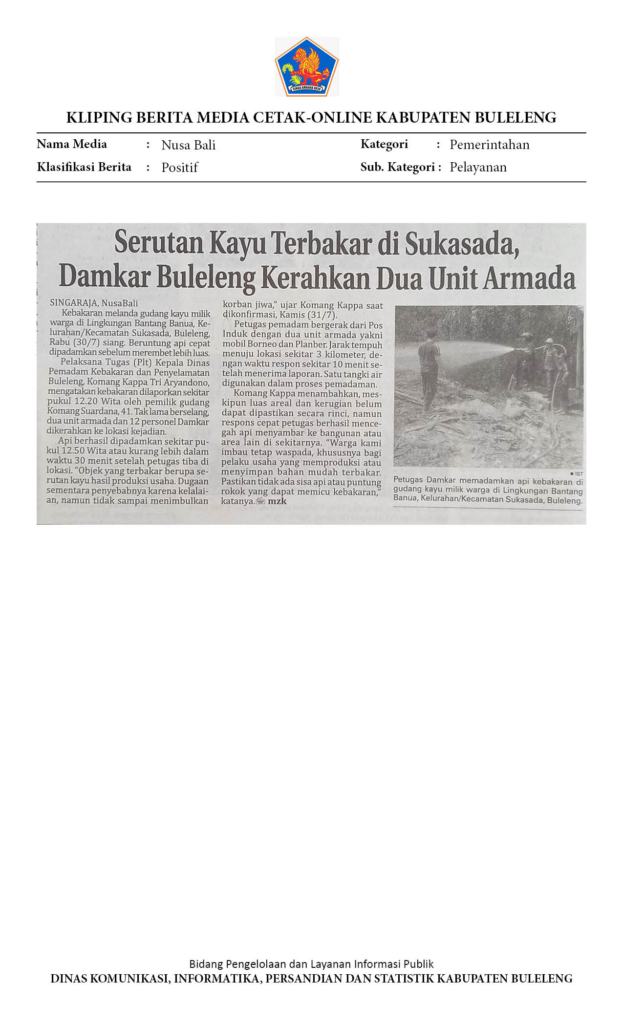 SERUTAN KAYU TERBAKAR DI SUKASADA, DAMKAR BULELENG KERAHKAN DUA UNIT ARMADA