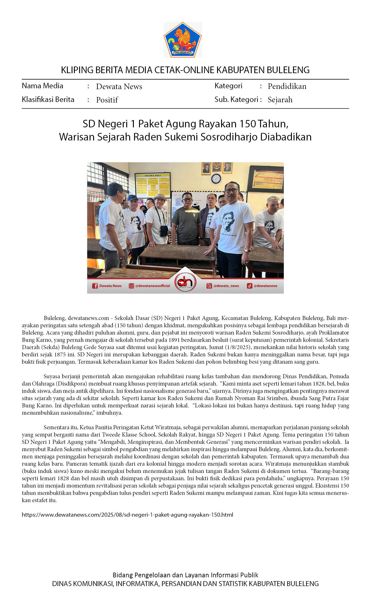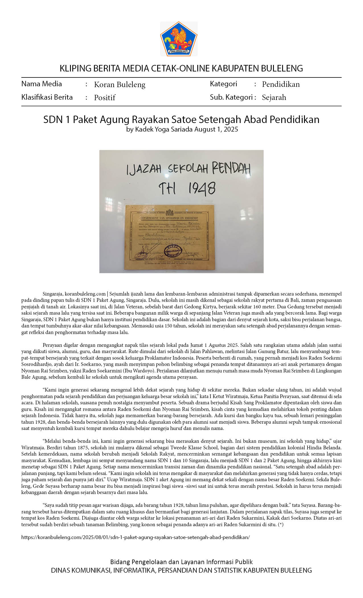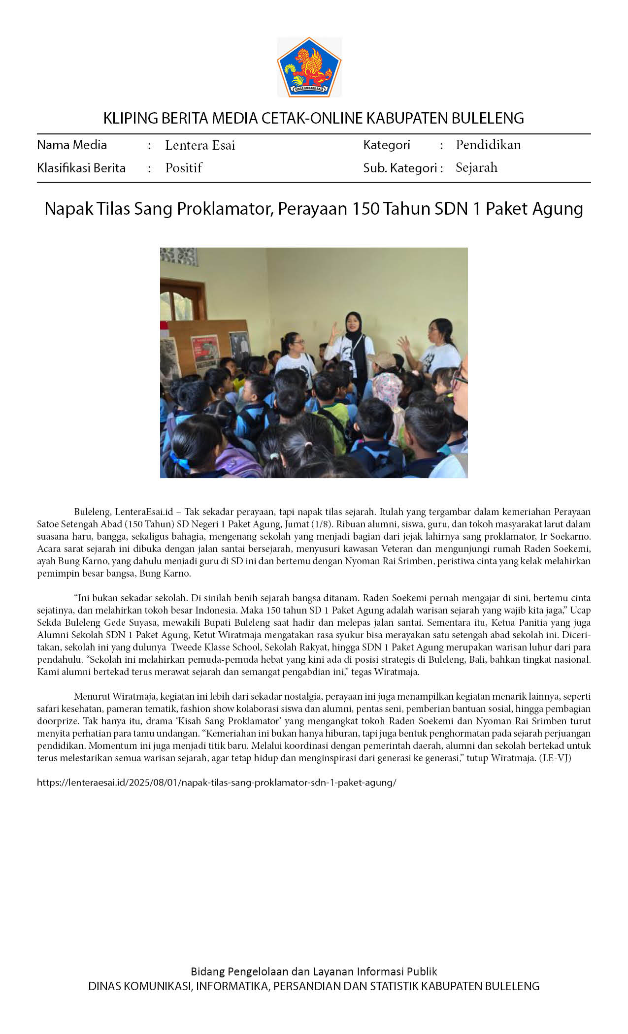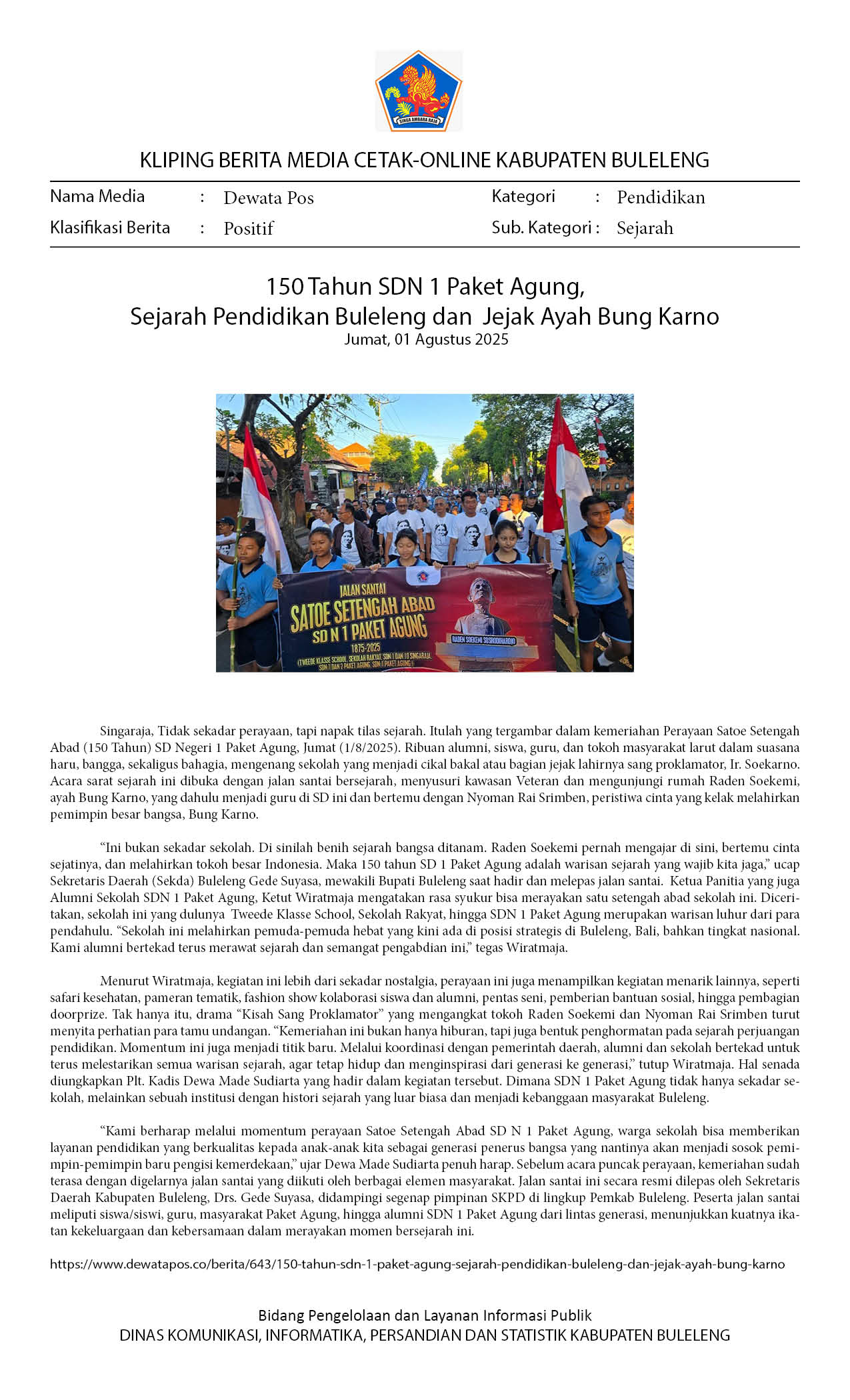 150 TAHUN SDN 1 PAKET AGUNG, SEJARAH PENDIDIKAN BULELENG DAN JEJAK AYAH BUNG KARNO