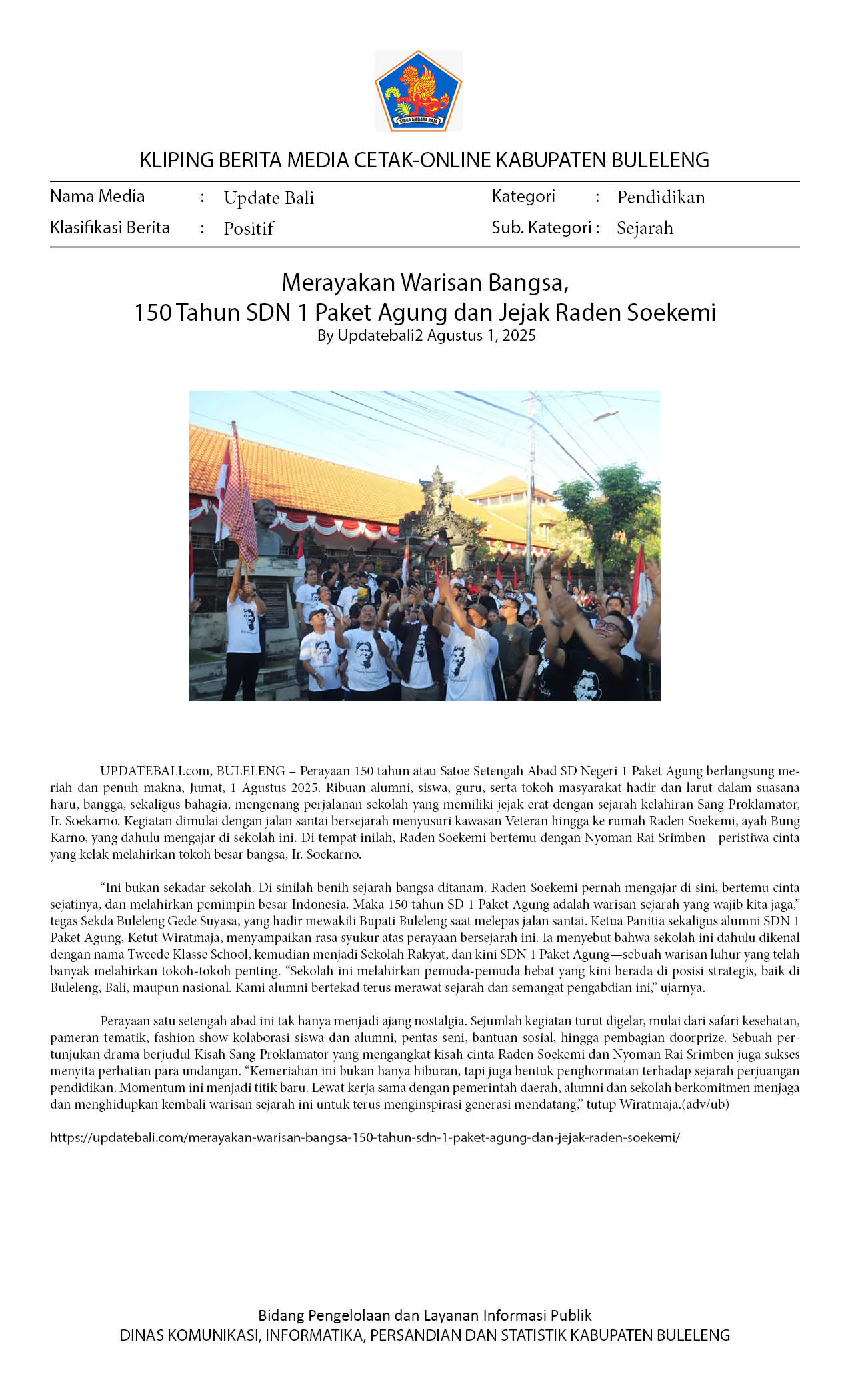 PERAYAAN 150 TAHUN SDN 1 PAKET AGUNG, NAPAK TILAS JEJAK LAHIRNYA SANG PROKLAMATOR BUNG KARNO