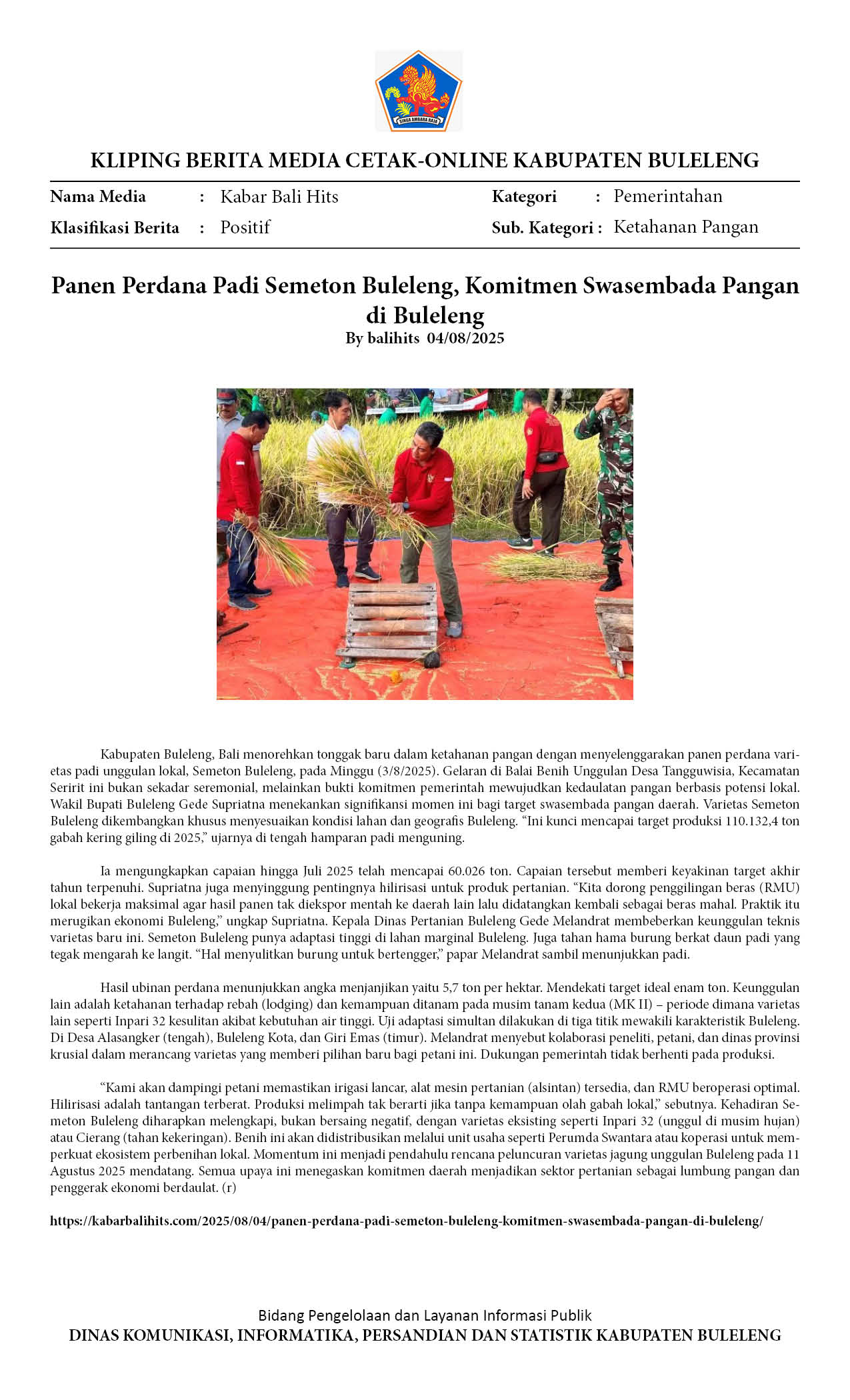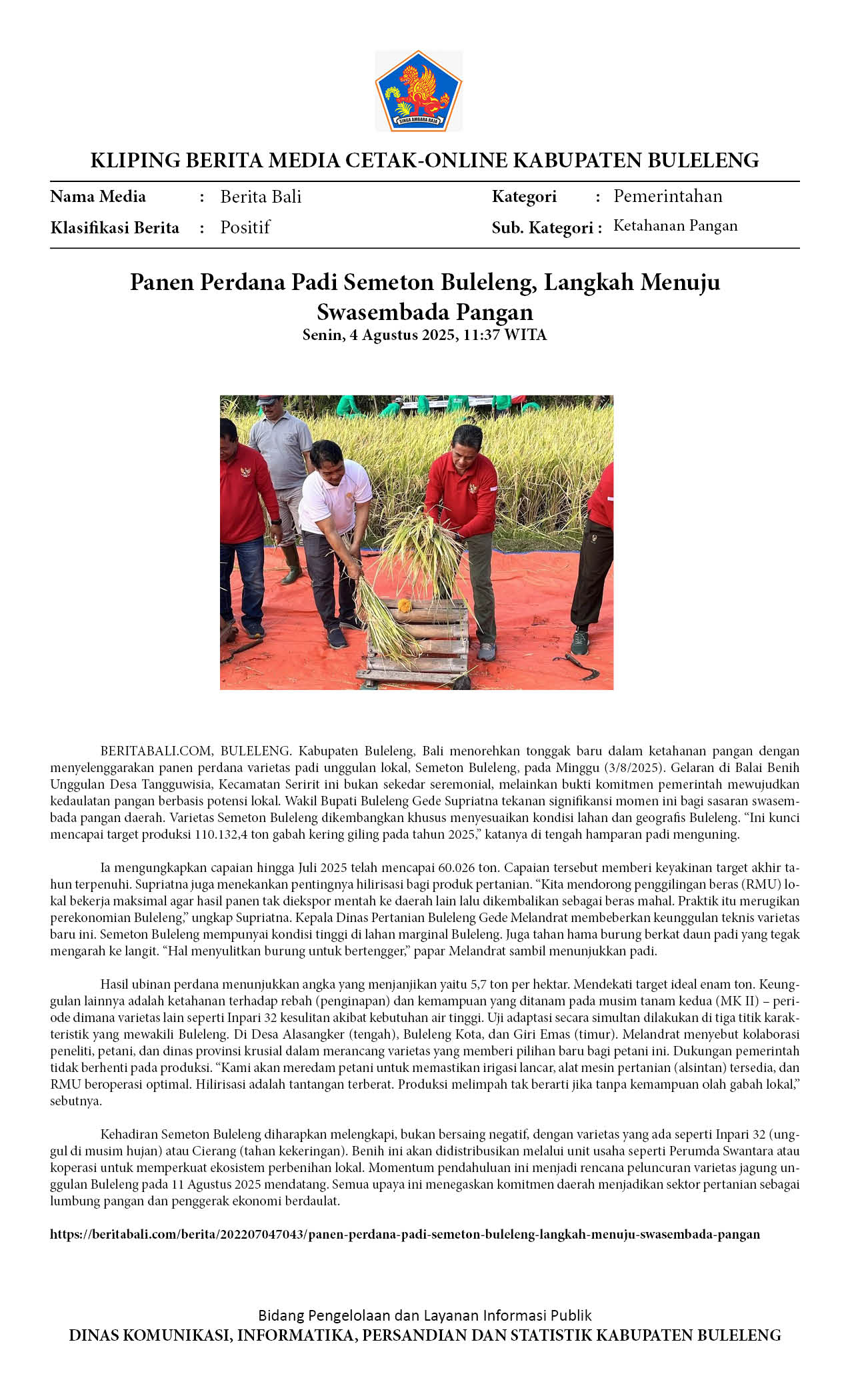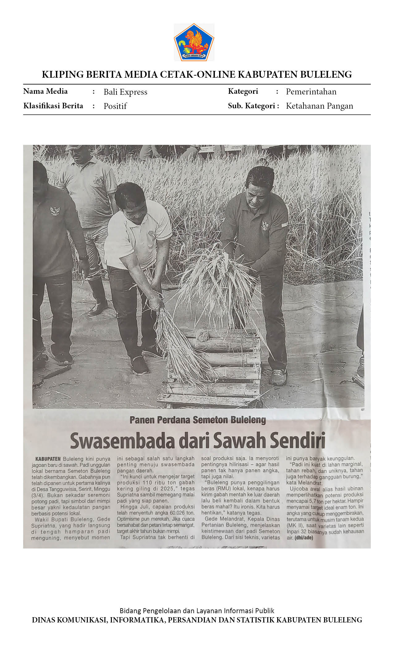 PANEN PERDANA PADI SEMETON BULELENG, KOMITMEN SWASEMBADA PANGAN DI BULELENG