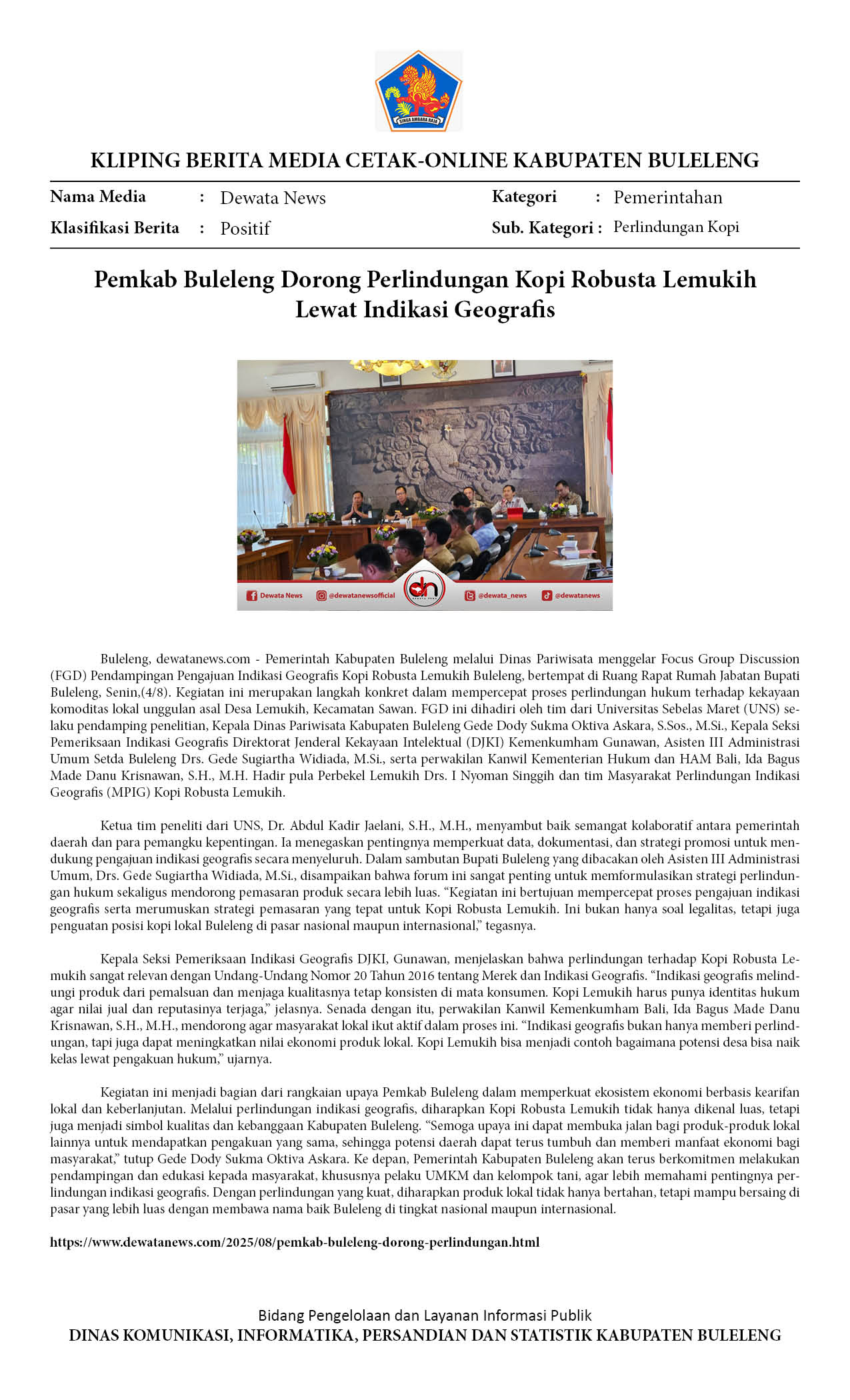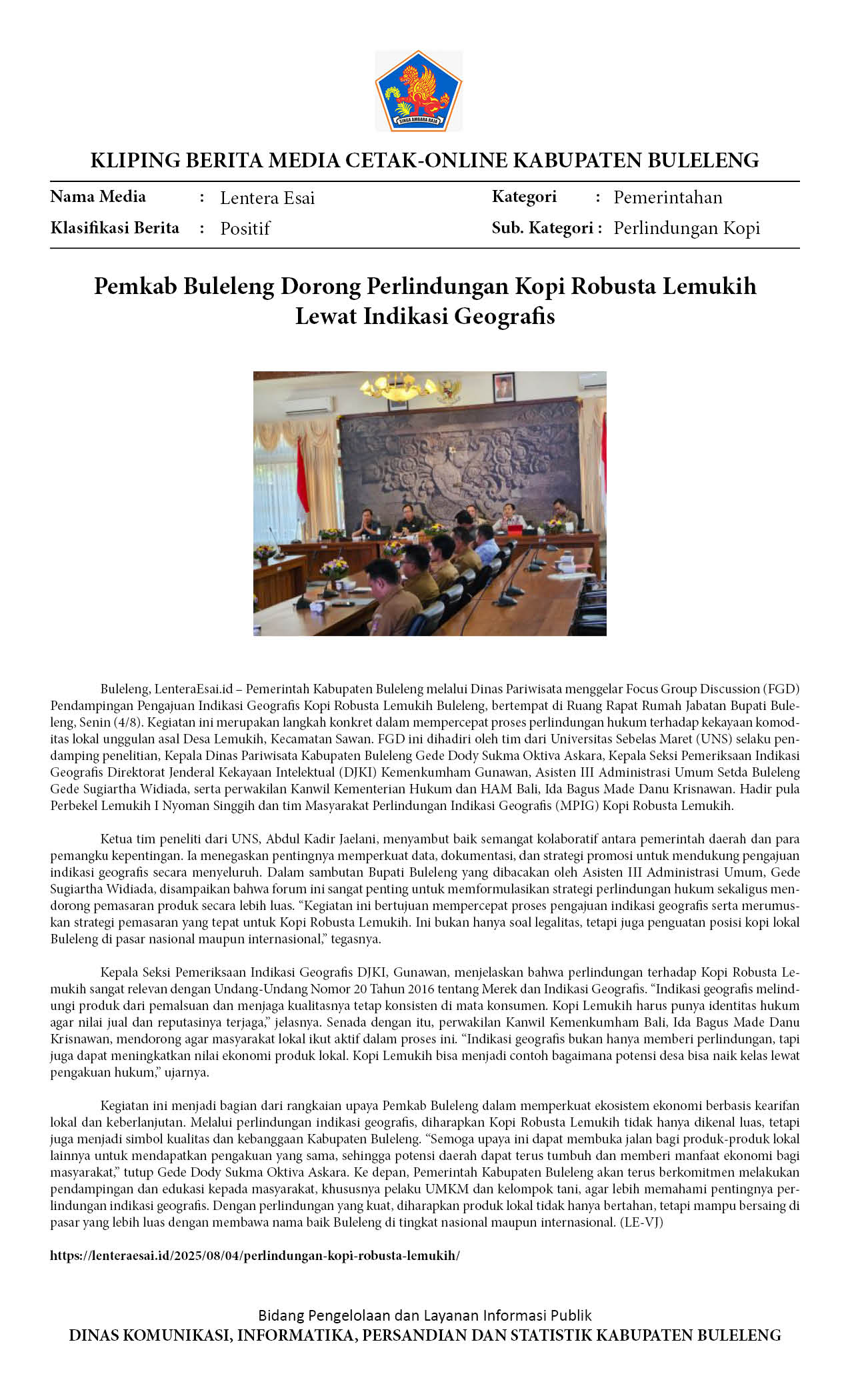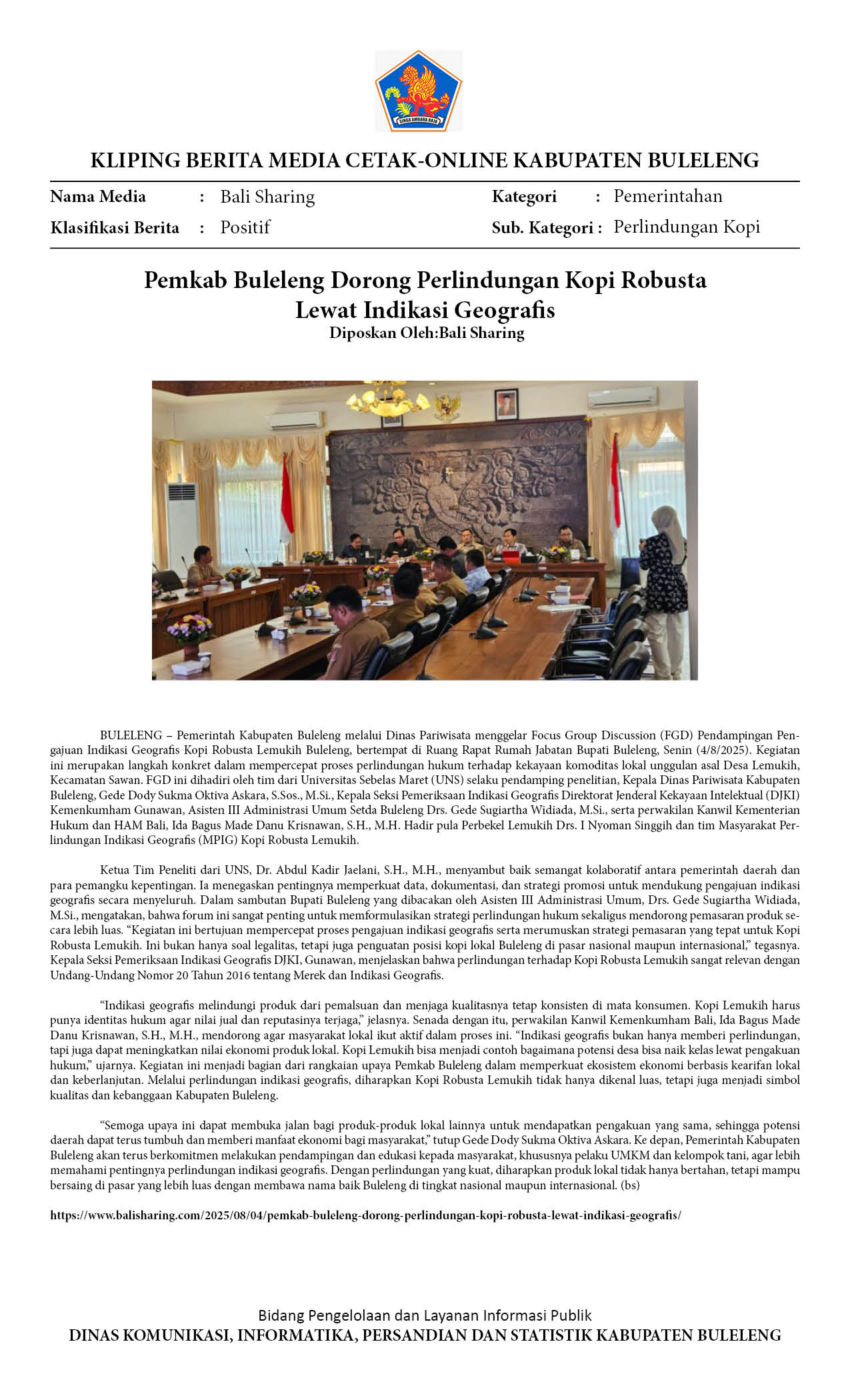 PEMKAB BULELENG DORONG PERLINDUNGAN KOPI ROBUSTA LEWAT INDIKASI GEOGRAFIS