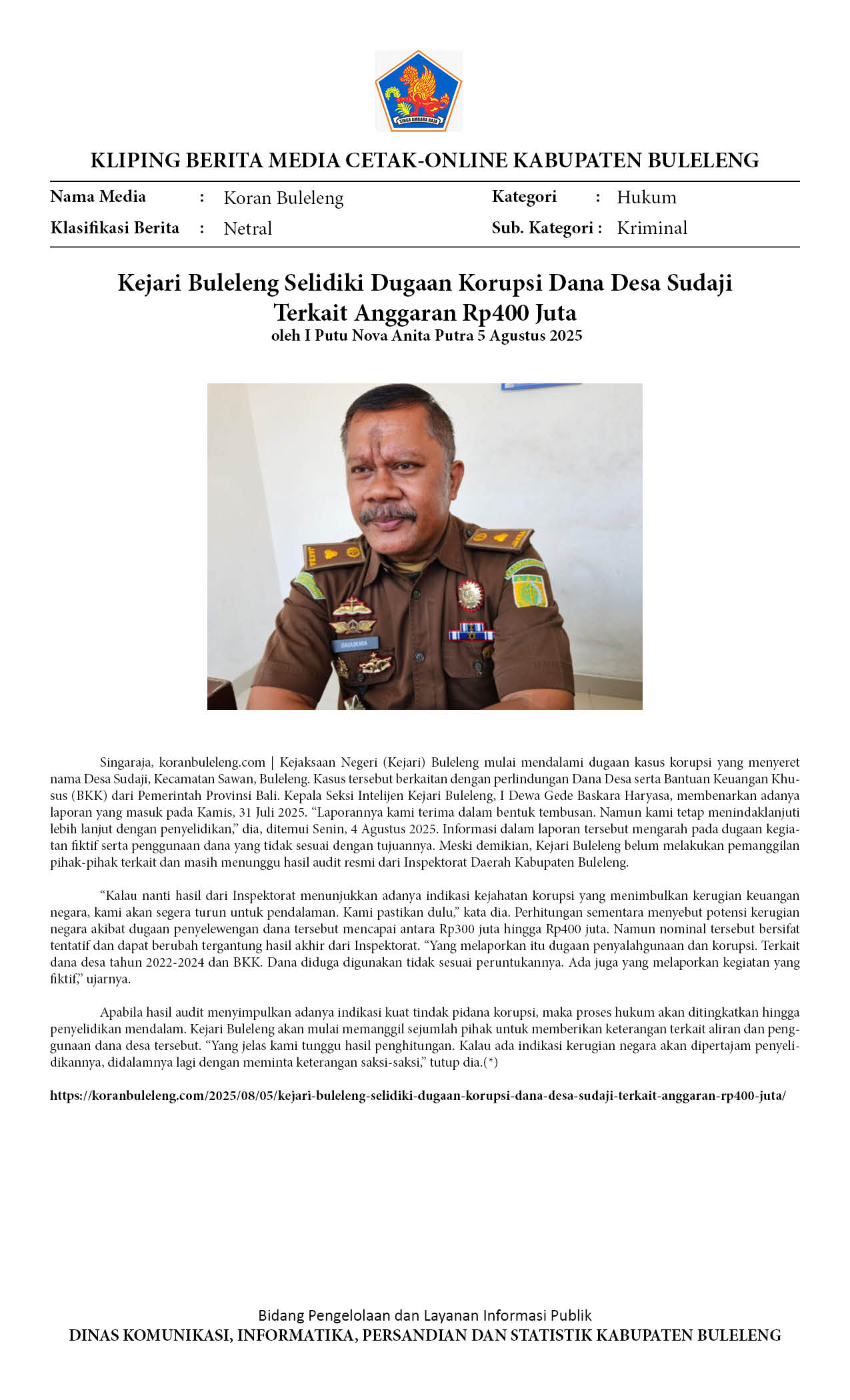 KEJARI BULELENG SELIDIKI DUGAAN KORUPSI DANA DESA SUDAJI TERKAIT ANGGARAN RP400 JUTA
