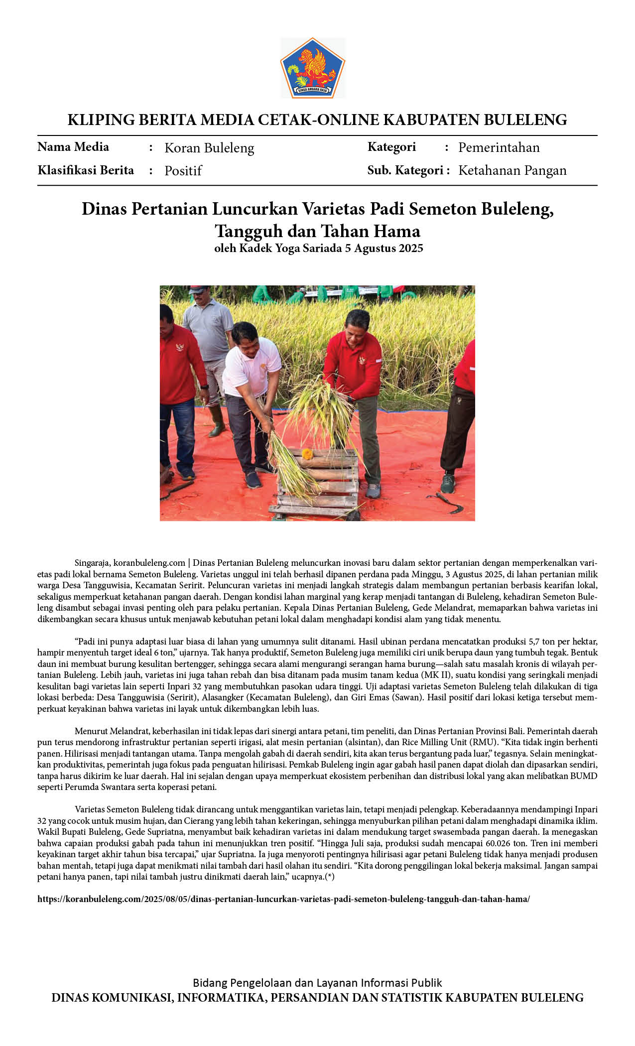 DINAS PERTANIAN LUNCURKAN VARIETAS PADI SEMETON BULELENG, TANGGUH DAN TAHAN HAMA
