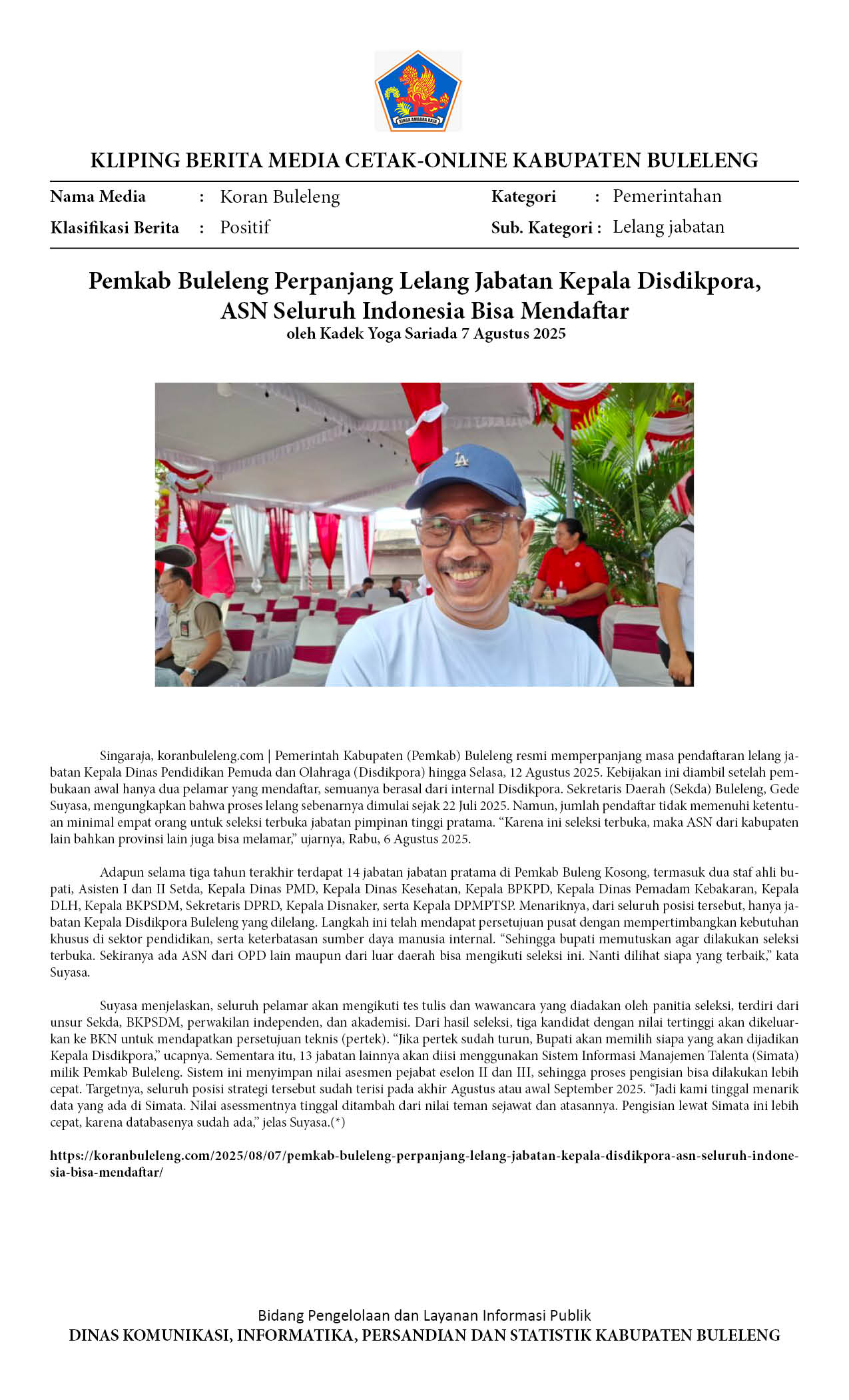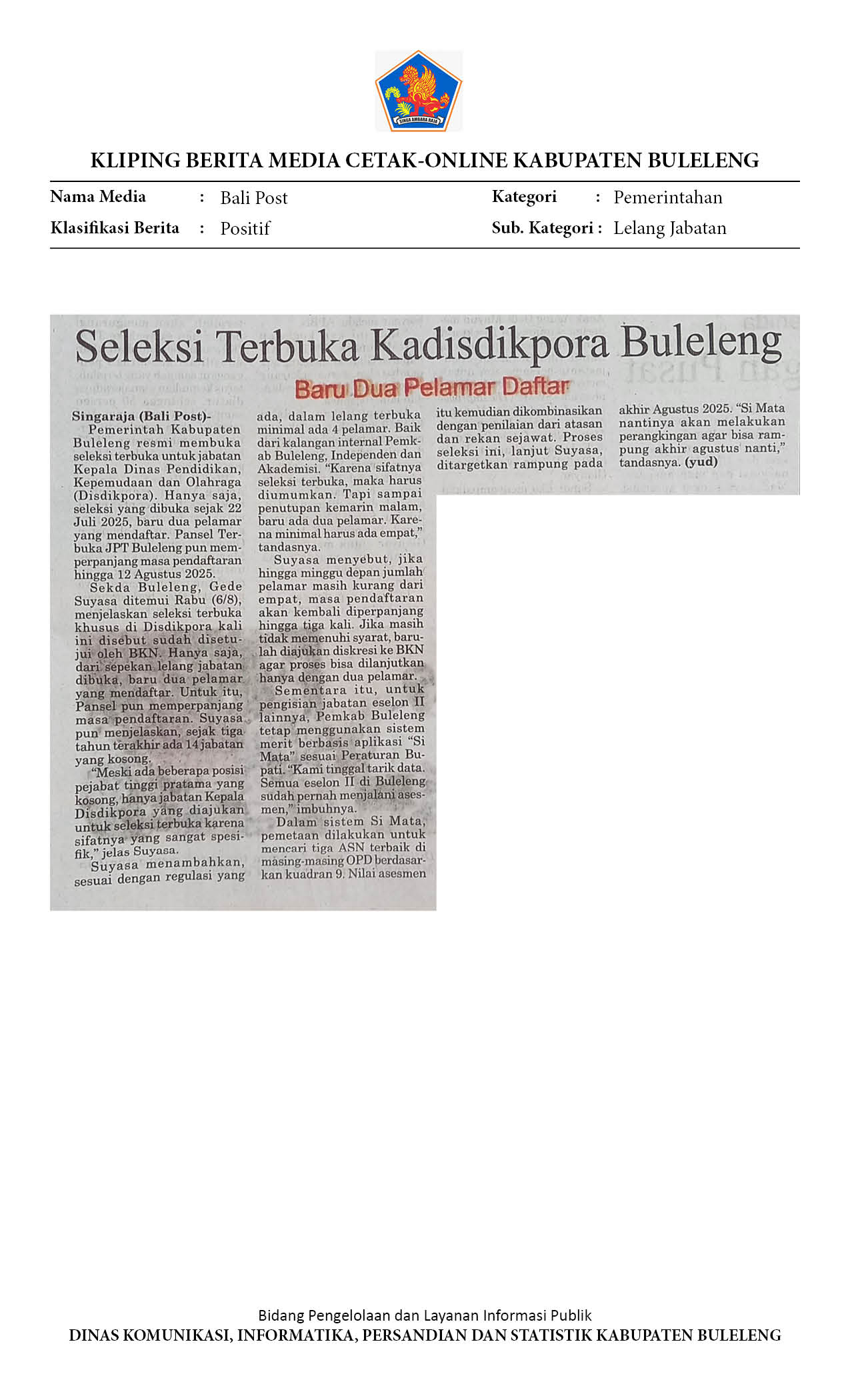 PEMKAB BULELENG PERPANJANG LELANG JABATAN KEPALA DISDIKPORA, ASN SELURUH INDONESIA BISA MENDAFTAR